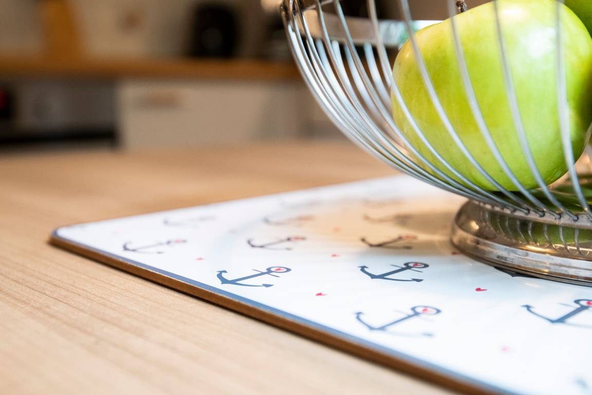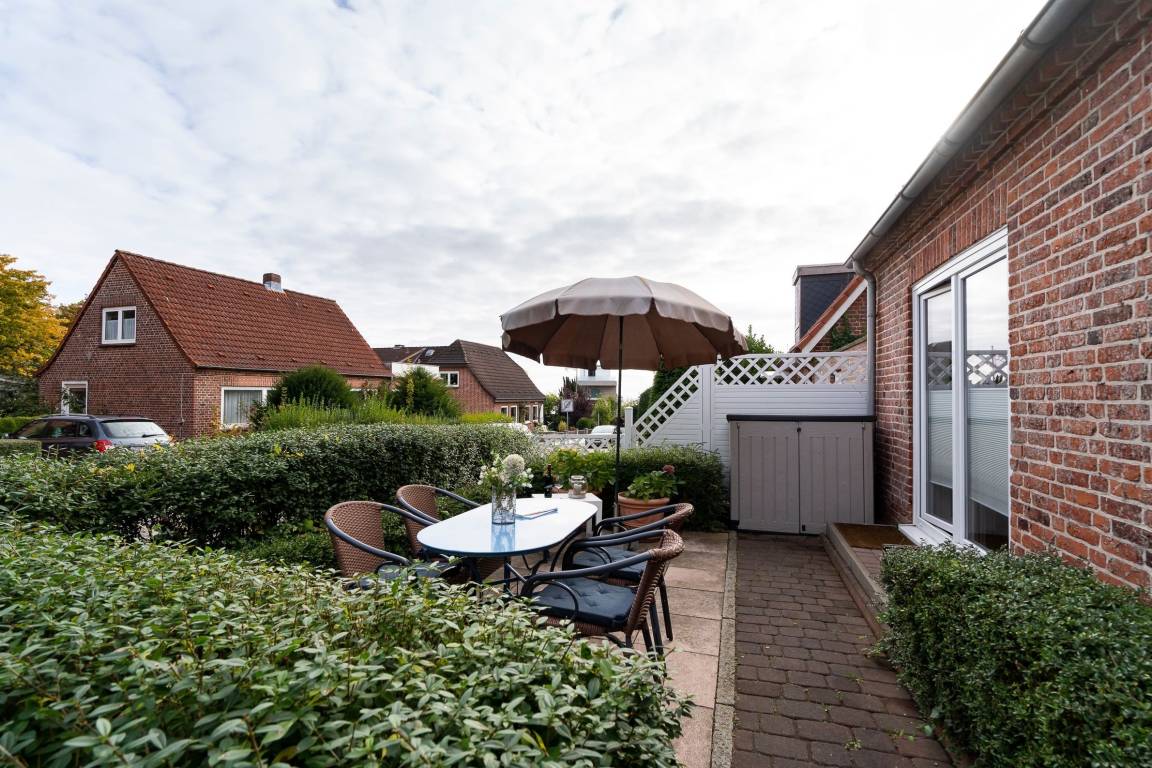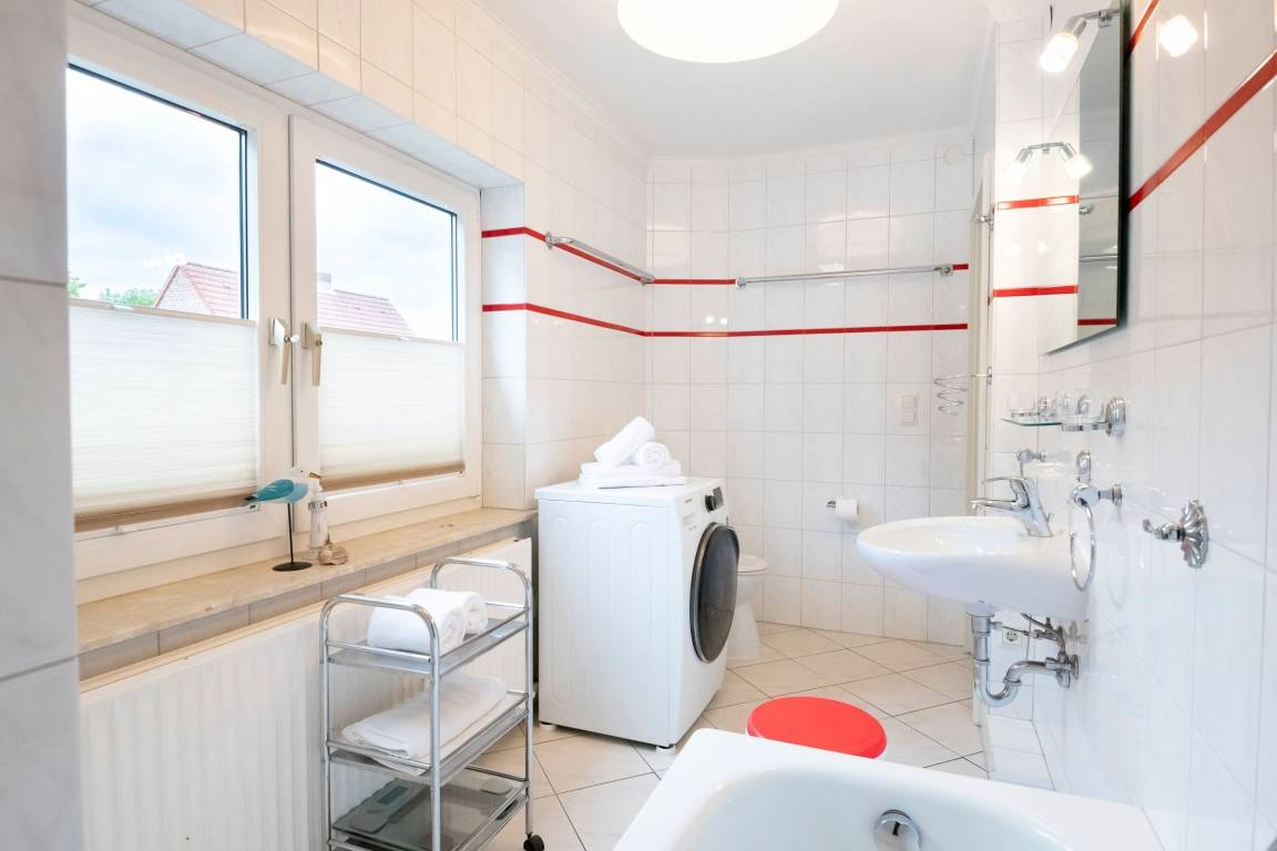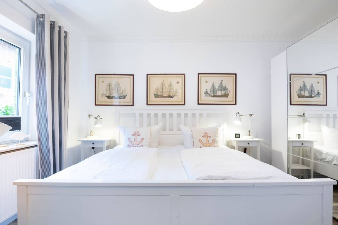 Der helle Eingangsbereich führt in alle Räume. Linkerhand liegt das separate Schlafzimmer im zeitlos schönen Landhausstil. Es liegt ruhig auf der Rückseite des Hauses und ist mit Flat-TV, komfortablem Doppelbett (2x 90x200 cm), sowie großzügigem Schiebetürenkleiderschrank für Ihre Urlaubsgarderobe ausgestattet. Rechts geht es dann in die separate, gut ausgestattete Küche mit Annehmlichkeiten wie ein neues Induktionskochfeld mit Backofen, Mikrowelle, neue Spülmaschine und Nespresso-Kaffeemaschine mit Milchaufschäumer. Ein gemütlicher Esstisch für 4 Personen sorgt für Geselligkeit und nette Runden. Geradeaus führt der Flur in das tageslichthelle Bad mit Dusche, Badewanne, Waschbecken mit beleuchtetem Spiegel und WC, herrlich großzügig gestaltet und klassisch weiß gefliest startet man hier gern in den Tag. Ihre Reisegarderobe können Sie hier in einem neu installierten Waschtrockner (Waschmaschine inklusive Trockner) reinigen.
