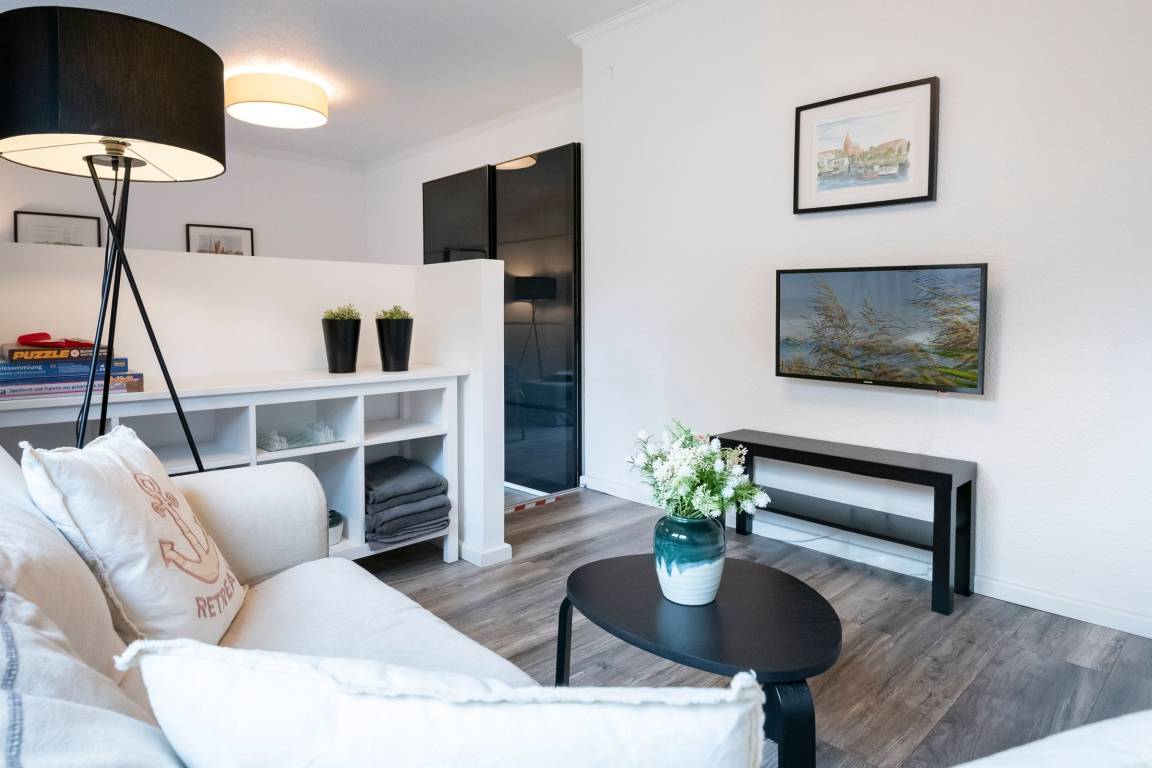 Und nun empfängt Sie das Herzstück Ihres Ferienhauses – der große Wohn-/Schlafbereich liegt hell und lichtdurchflutet mit direktem Zugang zur lauschigen Terrasse mit Ostausrichtung, hier lässt es sich wunderbar mit den ersten Sonnenstrahlen im Gesicht frühstücken. Ein absoluter Traum! Seitlich erhaschen Sie einen Blick auf die glitzernde Ostsee. Die durchdachte Gestaltung des Wohnraumes bietet zwei Komfort-Bereiche, sodass abends die hochwertige Eckcouch mit komfortablem Gel-Topper, problemlos zu einem Schlafbereich für 2 Personen umgestaltet werden kann - inkl. Flachbildschirm. Ein geräumiger Schrank bietet weiteren Stauraum. Ein dezenter Raumteiler offeriert Privatsphäre und bietet die Möglichkeit, sich auf einem zusätzlichen Sofa und Smart-TV zurückzuziehen. Das gesamte Interieur ist mit Bedacht und Stil aufeinander abgestimmt. Wohn- und Schlafzimmer sind mit verdunkelnden Plissees und Vorhängen ausgestattet, erholsame Nächte nach langen Strandtagen sind hier garantiert.