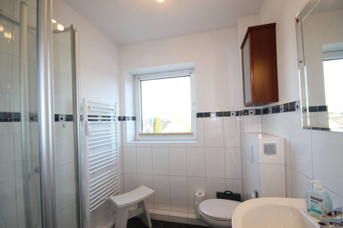 Hell gefliestes Tageslicht-Duschbad mit Eckdusche/ Glastrennwand, Waschbecken & WC.