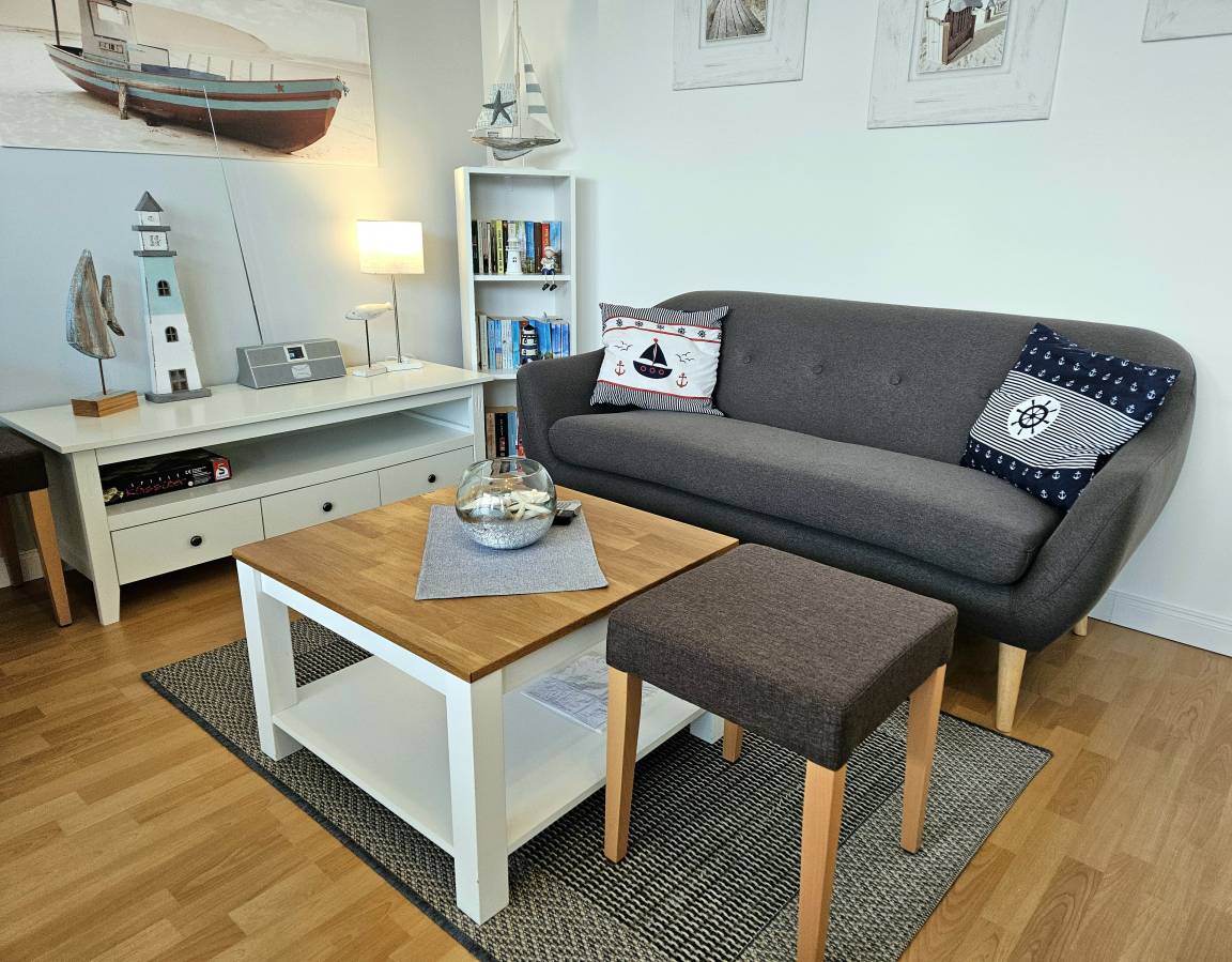 Die Wohnfläche der ca. 35 m² großen Ferienunterkunft verteilt sich auf einen Wohn- / Schlafraum, einen kleinen Flur, ein Badezimmer sowie auf eine kleine Küche. Der Wohnbereich ist mit einer gemütlichen Sitzecke, einem Essplatz sowie einem Doppel-Schrankbett (Maße: 1,60 x 2,00 m) versehen - ein LED-Flachbildschirm-TV und ein Radio sind hier ebenfalls vorhanden. Vom Wohnbereich aus haben Sie Zugang zum möblierten Balkon. Die separate kleine Küche ist u.a. mit einer Geschirrspülmaschine, einem Backofen, einer Kaffeemaschine und weiteren Küchengeräten ausgestattet. Das Badezimmer ist mit Dusche/WC versehen.