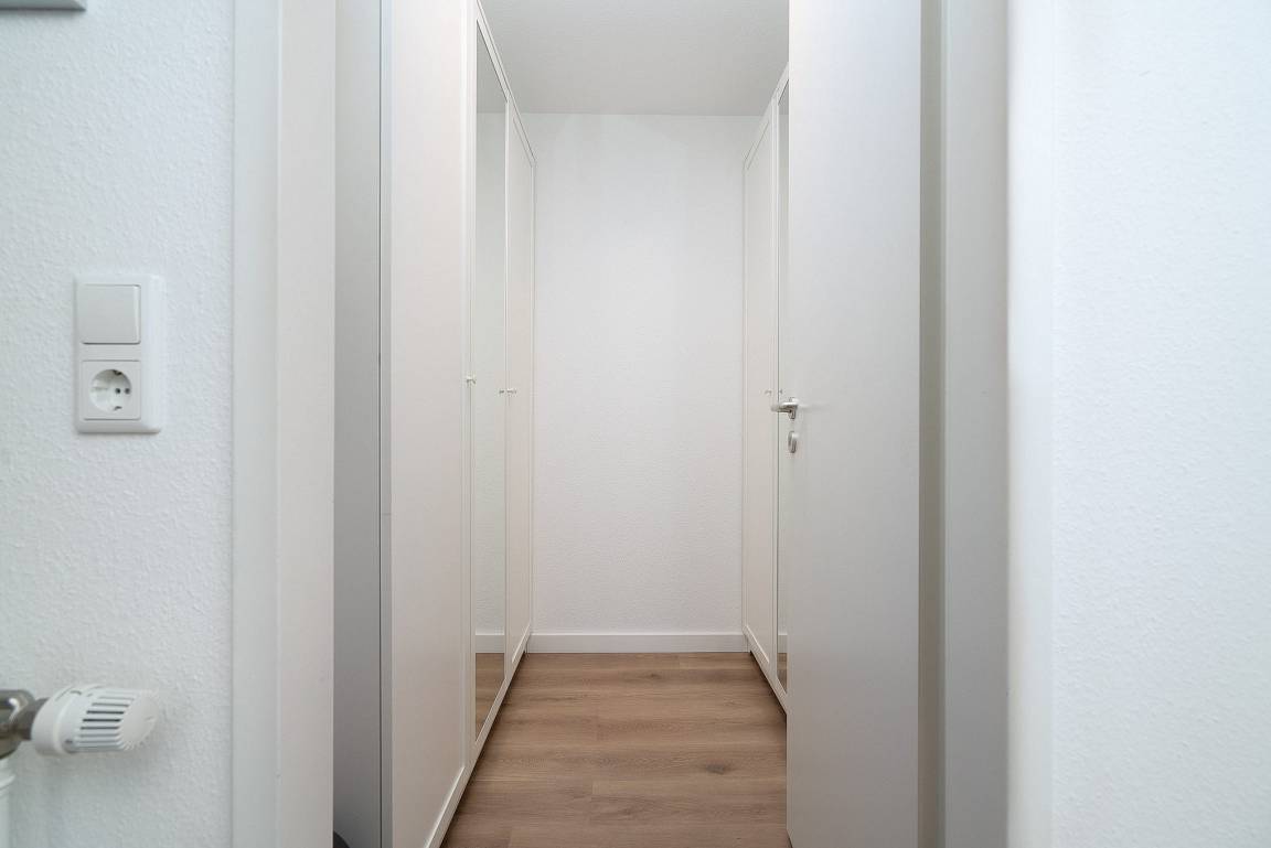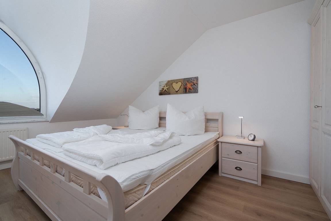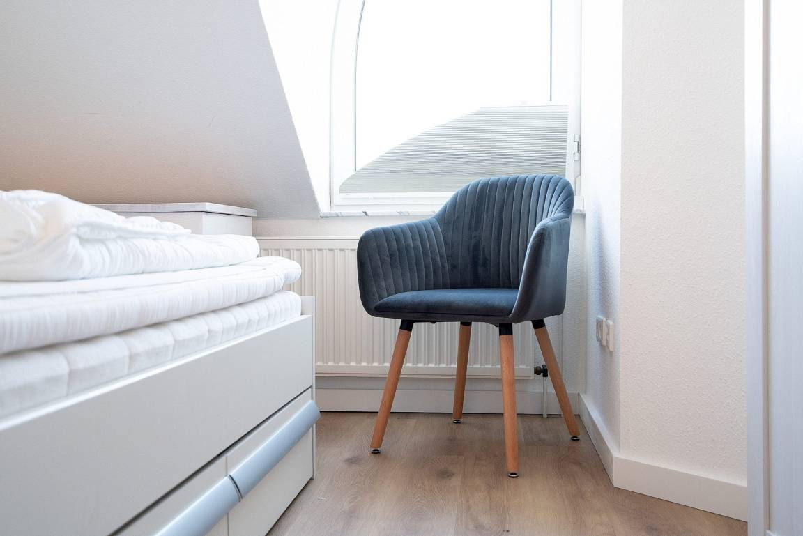 Das Schlafzimmer verfügt über ein kleines Doppelbett (140x200cm), einen 2-türigen Kleiderschrank. Das Zimmer ist mit Laminat ausgelegt und lässt sich durch ein Plissee blickdicht verdunkeln.