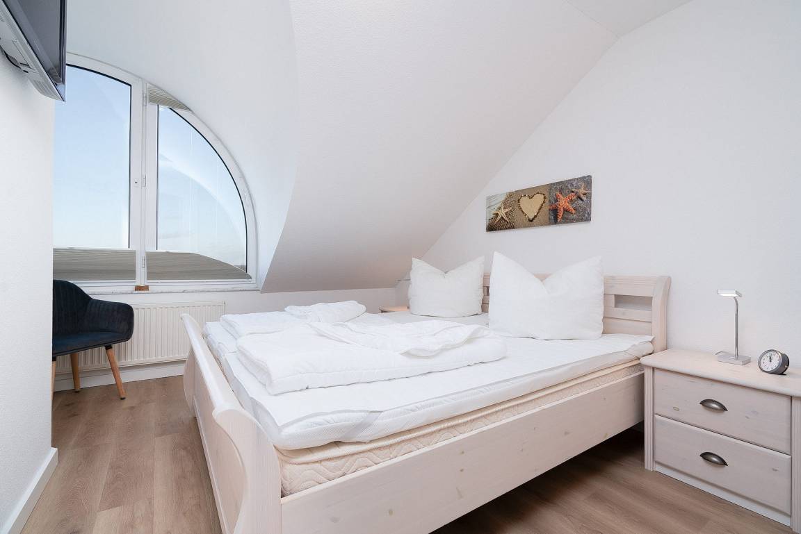 Das Schlafzimmer ist mit einem Doppelbett (2x90x200cm) und einem Kleiderschrank ausgestattet. Auch hier steht ein wandmontierter TV zur Unterhaltung bereit. Der Schlafbereich ist mit Laminat ausgelegt und lässt sich durch ein Plissee blickdicht verdunkeln.