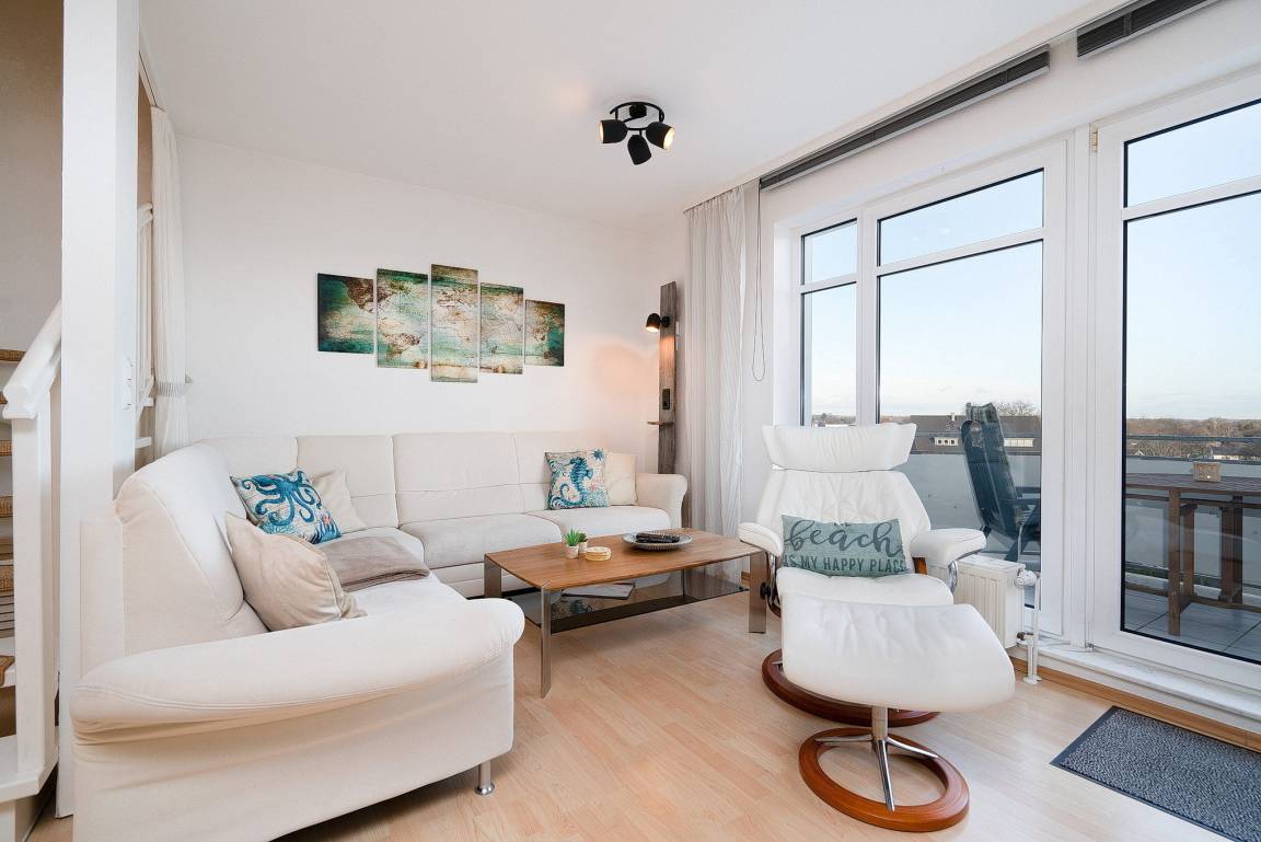 Heller, freundlicher, großzügiger Wohn- und Essbereich mit direktem Zugang zum Balkon. Der Raum verfügt über ein großes Ecksofa, einen Relax-Sessel sowie einen Essplatz für 4 Personen. Zur Unterhaltung stehen ein Smart-TV und ein Radio zur Verfügung. Der Wohnbereich ist mit Laminat ausgelegt und lässt sich durch Jalousien und Vorhänge blickdicht verdunkeln.