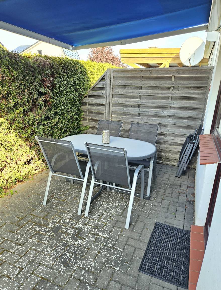 Die Terrasse zur Lübecker Str. ist 16 m² groß. Gartenmöbel sind vorhanden. Auf der Terrasse können Sie die Sonne von Mittags bis in die Abendstunden genießen oder sich durch die Markise vor der Sonneneinstrahlung schützen.