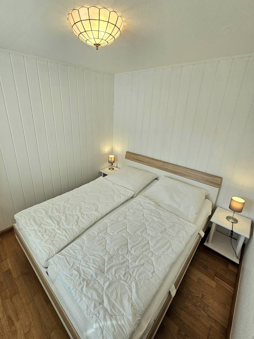 Das Schlafzimmer ist mit einem Doppelbett (160 x 200 cm, getrennte Matratzen) und Kleiderschränken eingerichtet.