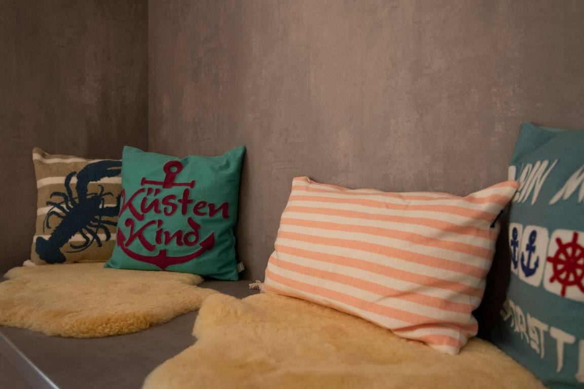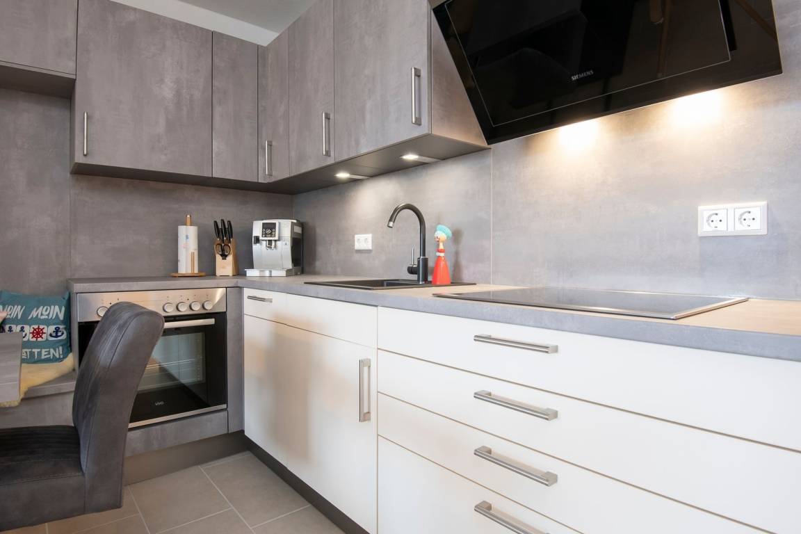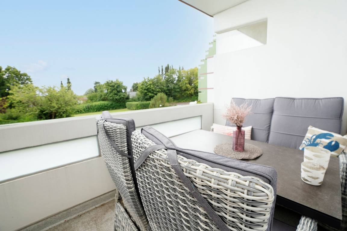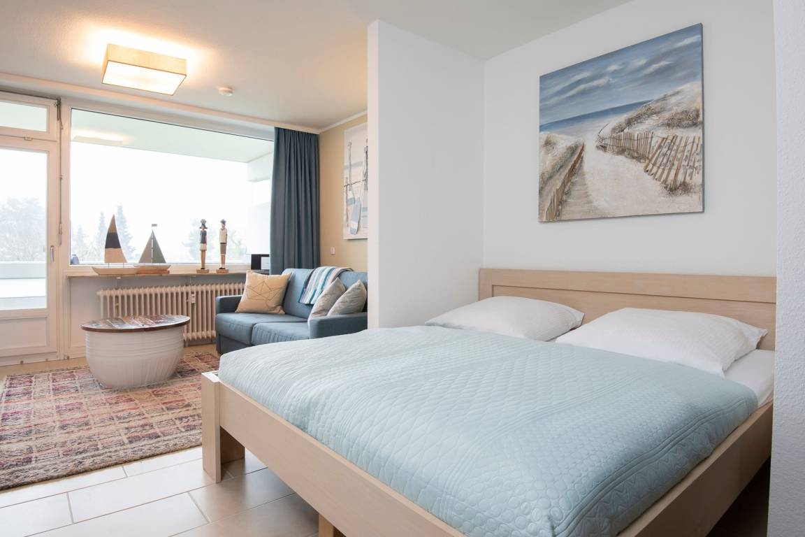 Durch ein geschicktes Einrichtungskonzept ist im offenen Wohn-, Schlaf- und Kochbereich alles komfortabel untergebracht. Tagsüber entspannen Sie auf dem bequemen Sofa, das Sie zur Nacht in eine gemütliche Schlafstätte (ca. 170x200 cm) für 2 Personen verwandeln können. Zusätzlich lädt ein großes Doppelbett (180x200 cm) zum Träumen und Erholen ein. Für Unterhaltung sorgt ein TV-Gerät oder der CD-Player. Verwöhnen Sie sich kulinarisch in der top ausgestatteten Küche mit 4-Kochfeld-Ceranherd, Backofen, Kühlschrank, Spülmaschine, deLonghi Kaffeeautomat, KitchenAid, Waffeleisen, Toaster, Wasserkocher und Sandwichmaker. Auf dem möblierten Balkon mit seitlichem, saisonalen Ostsee-Fernblick können Sie die gute Ostseeluft genießen. Bei Bedarf spendet ein Sonnenschirm Schatten. Ein Bad mit bodentiefer Dusche, Fön und beheizbarem Handtuchhalter komplettiert die Ausstattung dieser schönen Ferienwohnung.