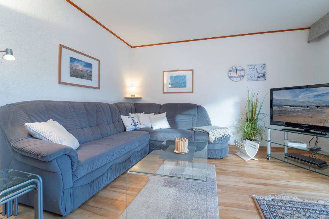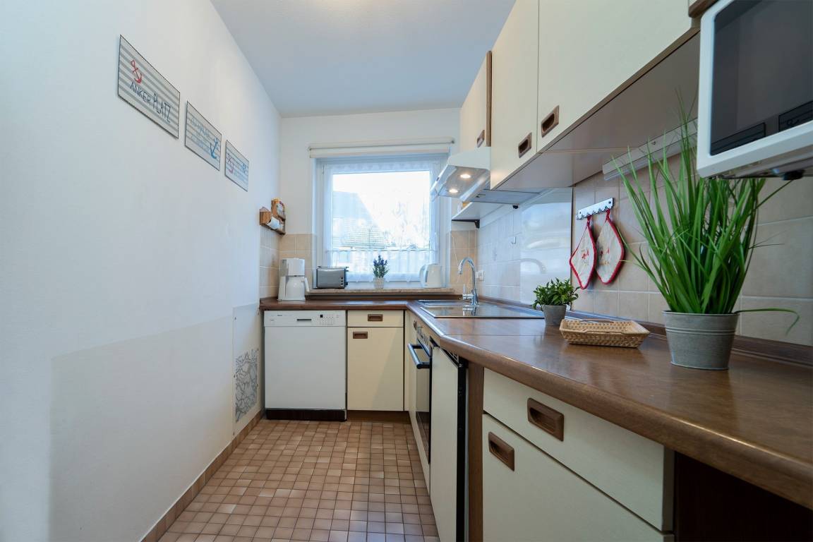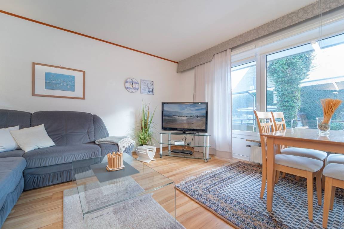Das großzügige Wohnzimmer mit Flat-TV und Blu-Ray-Player sowie direkt angrenzendem Balkon liegt ruhig an einem Fußweg. In der voll ausgestatteten Küche finden Sie alles, was Sie für die Zubereitung von Mahlzeiten benötigen. Für die Nachtruhe stehen Ihnen ein Schlafzimmer mit Doppelbett (2x 90x200 cm) sowie ein Schlafzimmer mit Einzelbett, unter dem Sie noch ein weiteres Bett ausziehen können (je 90x200 cm) zur Verfügung. Die geschmackvolle Einrichtung der Wohnung lässt keine Wünsche offen.