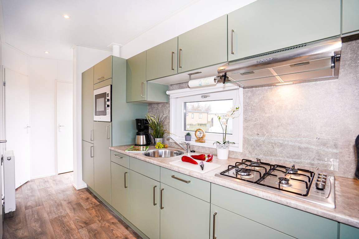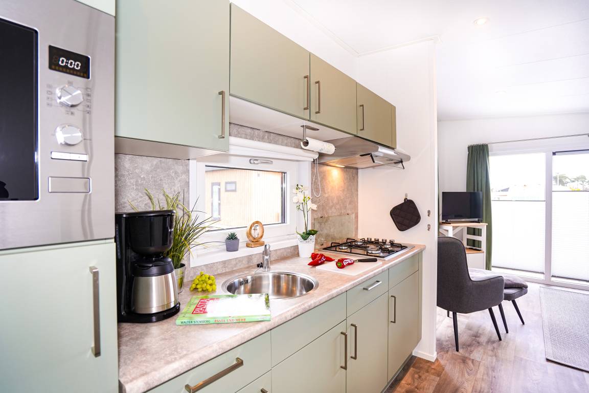 Diese gemütlichen Unterkünfte bieten Platz für bis zu 4 Personen und sind perfekt für einen entspannten Urlaub. Jedes Mobilheim verfügt über eine voll ausgestattete Küche mit Gasherd und Mikrowelle, Kühl- und Gefrierkombination, Geschirrspüler, Kaffeemaschine und Wasserkocher. Ein modernes Badezimmer mit Dusche, WC und Waschtisch sowie zwei einladende Schlafzimmer (ein Doppelbett 2x80x200cm und zwei Einzelbetten 80x200cm) sorgen für Ihren Komfort.