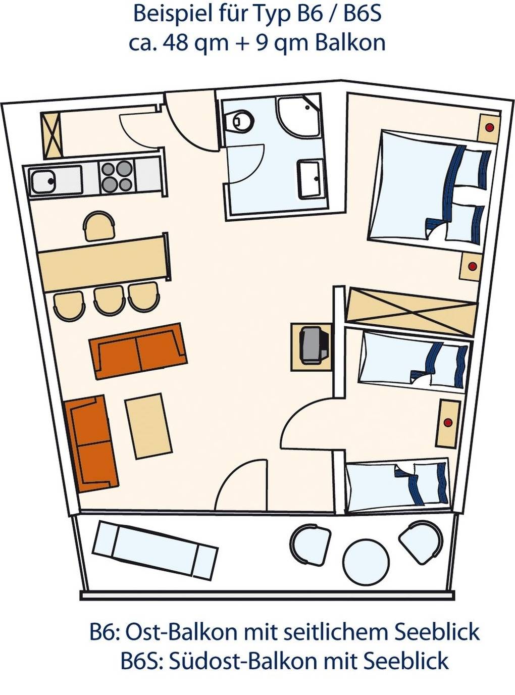 Die Ferienwohnungen vom Typ B6S liegen im 2. bis 4. Geschoss und haben einen Wohnraum mit Doppelbetten in einer Schlafnische, ein Kinderzimmer mit 2 Einzelbetten, Kochnische, Dusche, WC, einen Ostbalkon und seitlichem Seeblick. Die Wohnfläche beträgt 48 qm. Diese Wohnungen sind für den Aufenthalt von 2 bis 4 Personen geeignet.