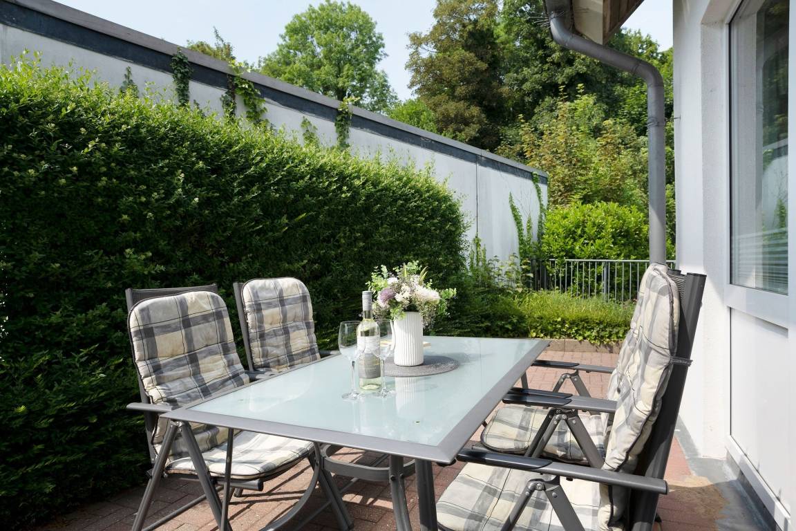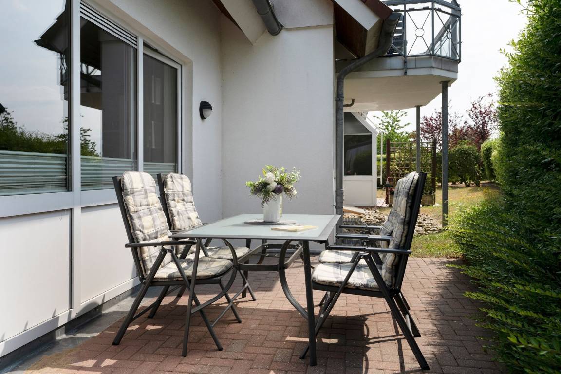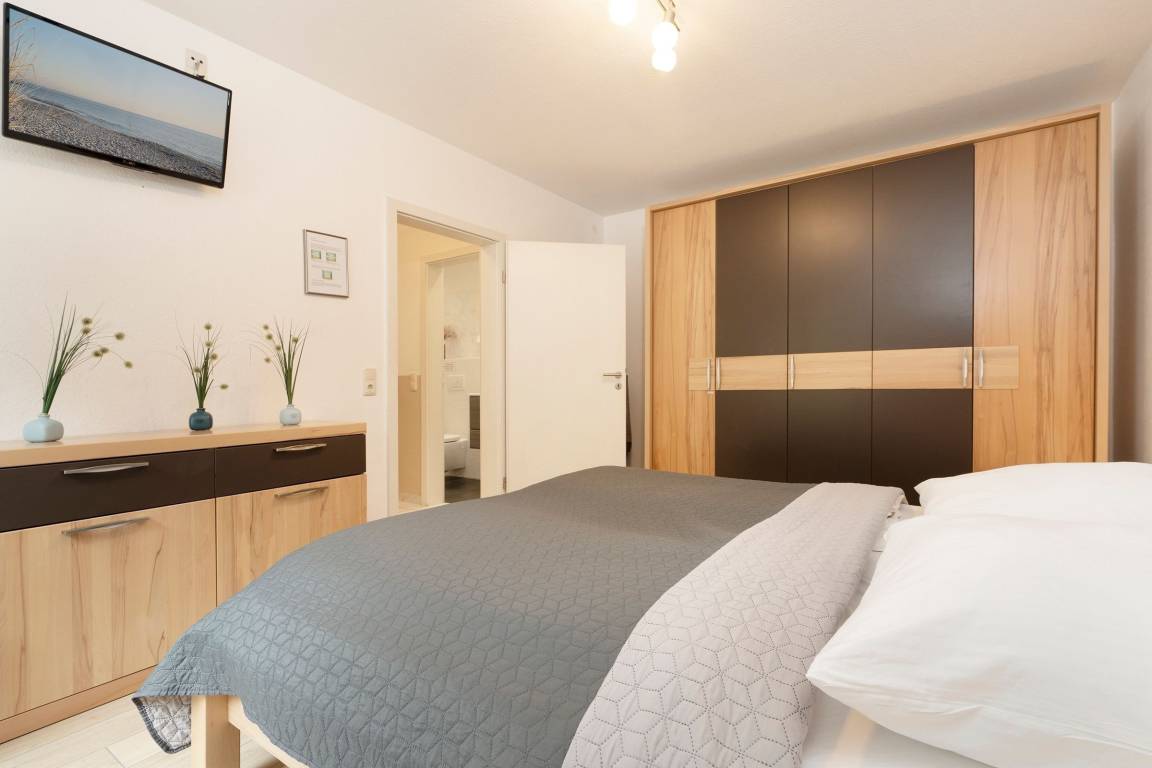 Im oberen Bereich der Wohnung finden Sie ein großes einladendes Wohnzimmer mit Sofalandschaft, Flat-TV und DVD-Player. Um mit Ihren Liebsten Daheim in Kontakt zu bleiben, steht Ihnen ein kostenloser WLAN-Anschluss zur Verfügung. Angrenzend liegt die halboffene, geräumige Küche mit Essplatz. Sie ist vollständig mit Geschirrspüler, Mikrowelle, vielerlei Geschirr und Zubehör eingerichtet ist, so dass der Hobbykoch auch im Urlaub auf nichts verzichten muss. Nur eine Treppe tiefer können Sie sich in die Kissen des großen gemütlichen Doppelbettes (180x200 cm) fallen lassen und Energie für einen neuen Urlaubstag tanken. Bei Bedarf sorgt ein 2. Flat-TV für Unterhaltung. Ein zweites separates Schlafzimmer lädt mit 2 Einzelbetten (je 90x200 cm) ebenfalls zum Träumen ein. Die mitgebrachte Urlaubsgarderobe kann in den Kleiderschränken mühelos untergebracht werden. Im hellgefliesten Duschbad lassen sich die letzten Sandkörner vom Strandtag beseitigen, bei Bedarf mit musikalischer Untermalung, denn hier gibt es ein Radio. Diese Wohnung wartet mit gleich zwei möblierten Terrassen auf, so haben Sie die freie Auswahl und können die Sonne bis in den Abend hinein genießen.