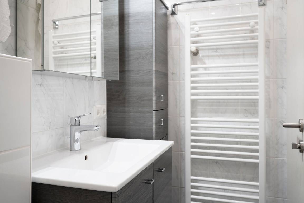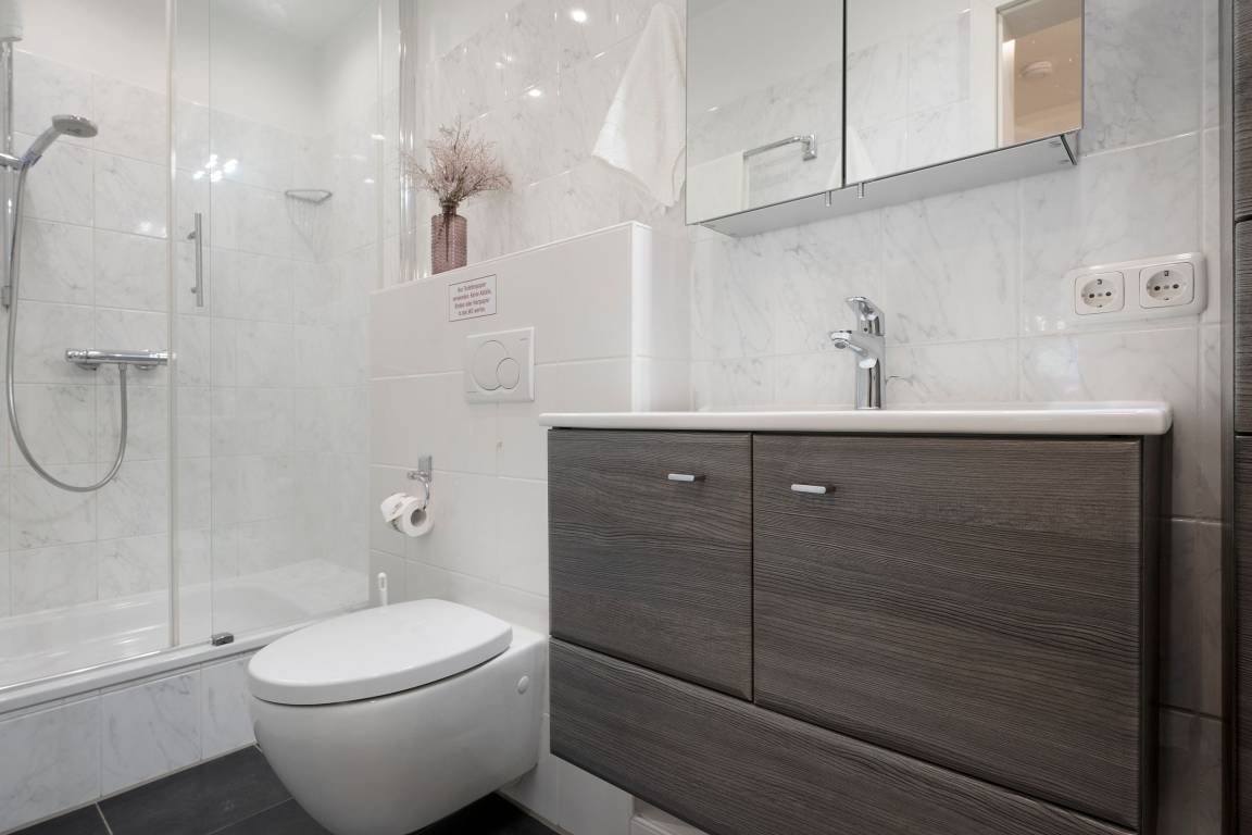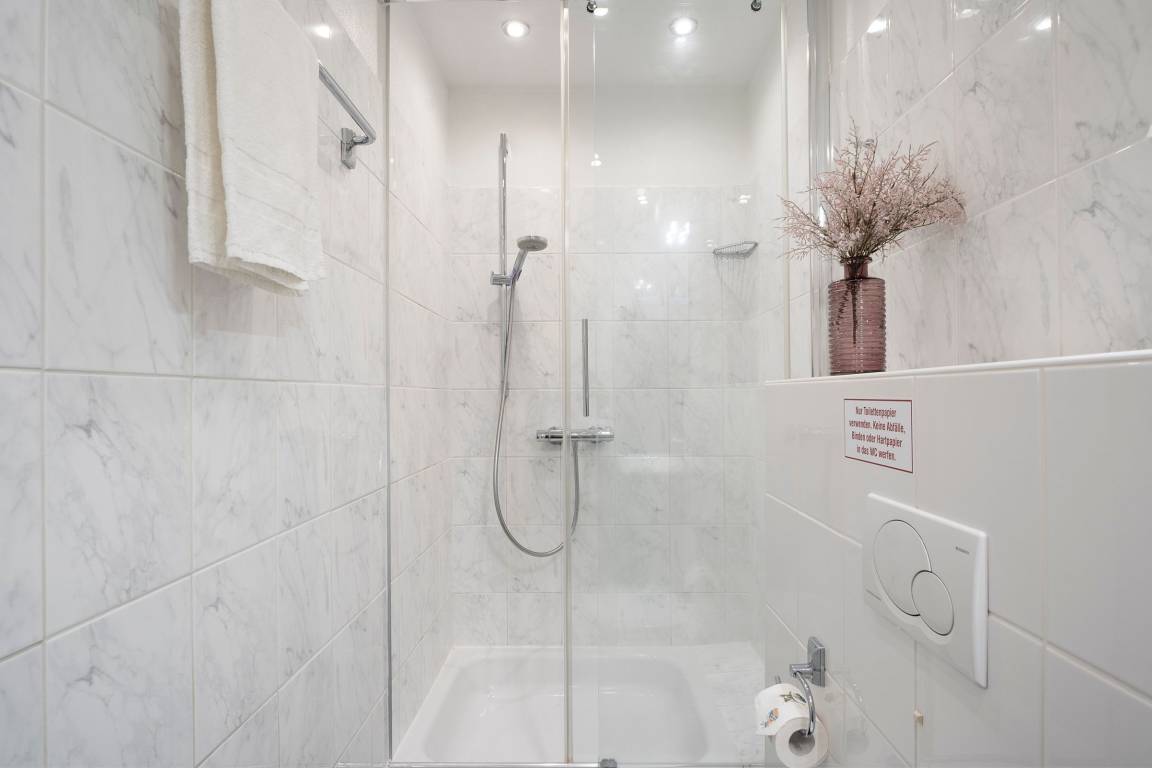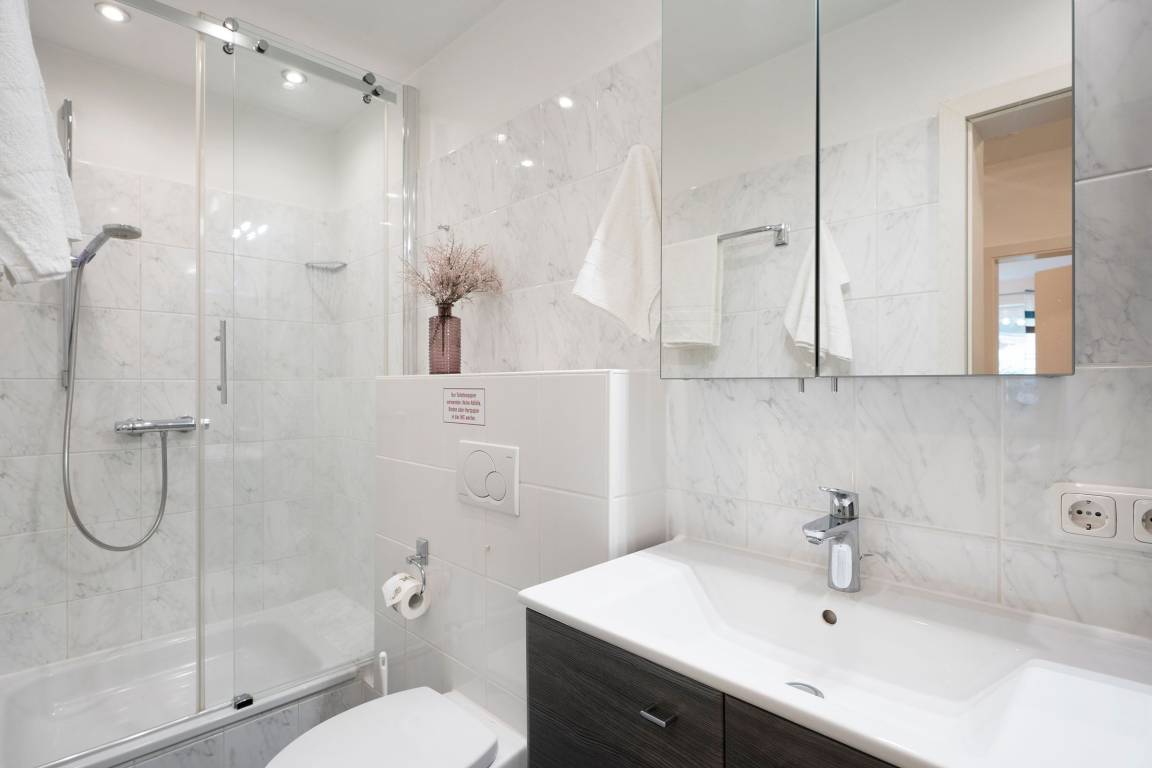 Im oberen Bereich der Wohnung finden Sie ein großes einladendes Wohnzimmer mit Sofalandschaft, Flat-TV und DVD-Player. Um mit Ihren Liebsten Daheim in Kontakt zu bleiben, steht Ihnen ein kostenloser WLAN-Anschluss zur Verfügung. Angrenzend liegt die halboffene, geräumige Küche mit Essplatz. Sie ist vollständig mit Geschirrspüler, Mikrowelle, vielerlei Geschirr und Zubehör eingerichtet ist, so dass der Hobbykoch auch im Urlaub auf nichts verzichten muss. Nur eine Treppe tiefer können Sie sich in die Kissen des großen gemütlichen Doppelbettes (180x200 cm) fallen lassen und Energie für einen neuen Urlaubstag tanken. Bei Bedarf sorgt ein 2. Flat-TV für Unterhaltung. Ein zweites separates Schlafzimmer lädt mit 2 Einzelbetten (je 90x200 cm) ebenfalls zum Träumen ein. Die mitgebrachte Urlaubsgarderobe kann in den Kleiderschränken mühelos untergebracht werden. Im hellgefliesten Duschbad lassen sich die letzten Sandkörner vom Strandtag beseitigen, bei Bedarf mit musikalischer Untermalung, denn hier gibt es ein Radio. Diese Wohnung wartet mit gleich zwei möblierten Terrassen auf, so haben Sie die freie Auswahl und können die Sonne bis in den Abend hinein genießen.