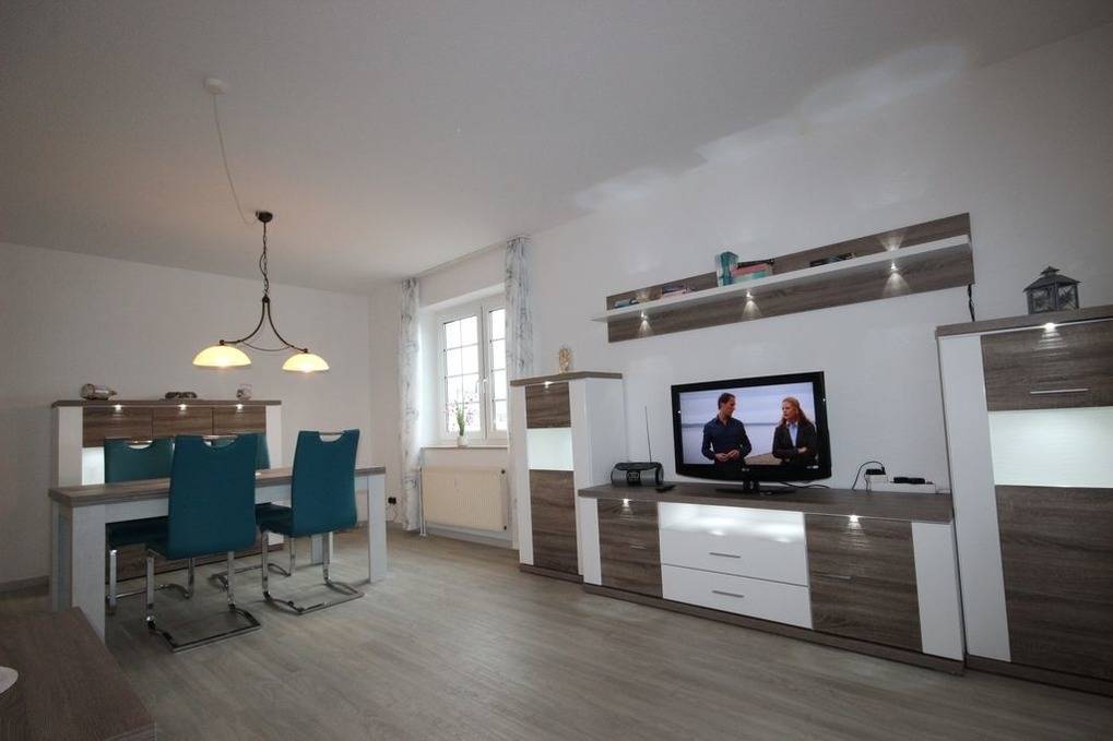Im gemütlichen, neu eingerichteten Wohnraum befindet sich ein Essplatz für 4 Personen, Schrankwand mit TV, eine lederartige, komfortable Couch (ausziehbar als Bett für 2 Personen) & zwei Fernsehsessel zum Relaxen. Hier haben Sie Zugang zum möblierten, sonnigen West-Balkon.