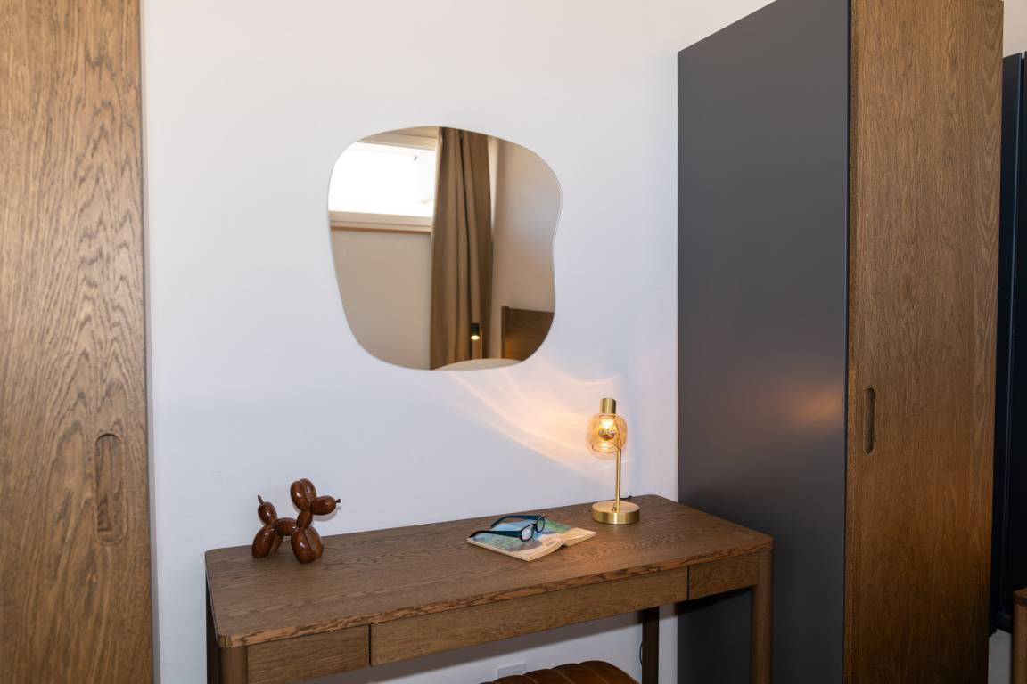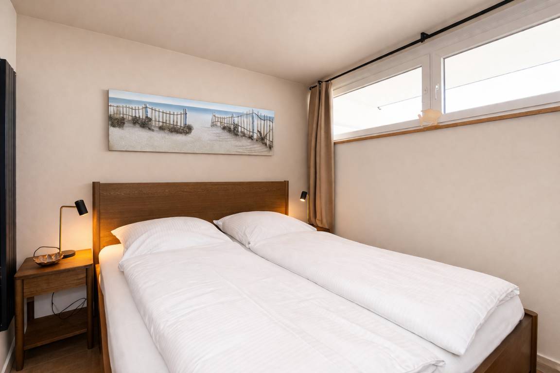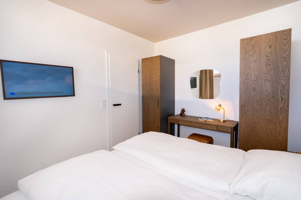 Das Schlafzimmer ist mit einem geräumigen Doppelbett (180x200cm; durchgehende Matratze) sowie zwei Kleiderschränken und einem Schreibtisch ausgestattet. Ein Flachbild-TV sorgt auch hier für Unterhaltung. In erdigen warmen Farbtönen gehalten, bietet sich hier ein hoher Schlafkomfort. Die Fenster lassen sich mit Vorhängen fast vollständig verdunkeln.