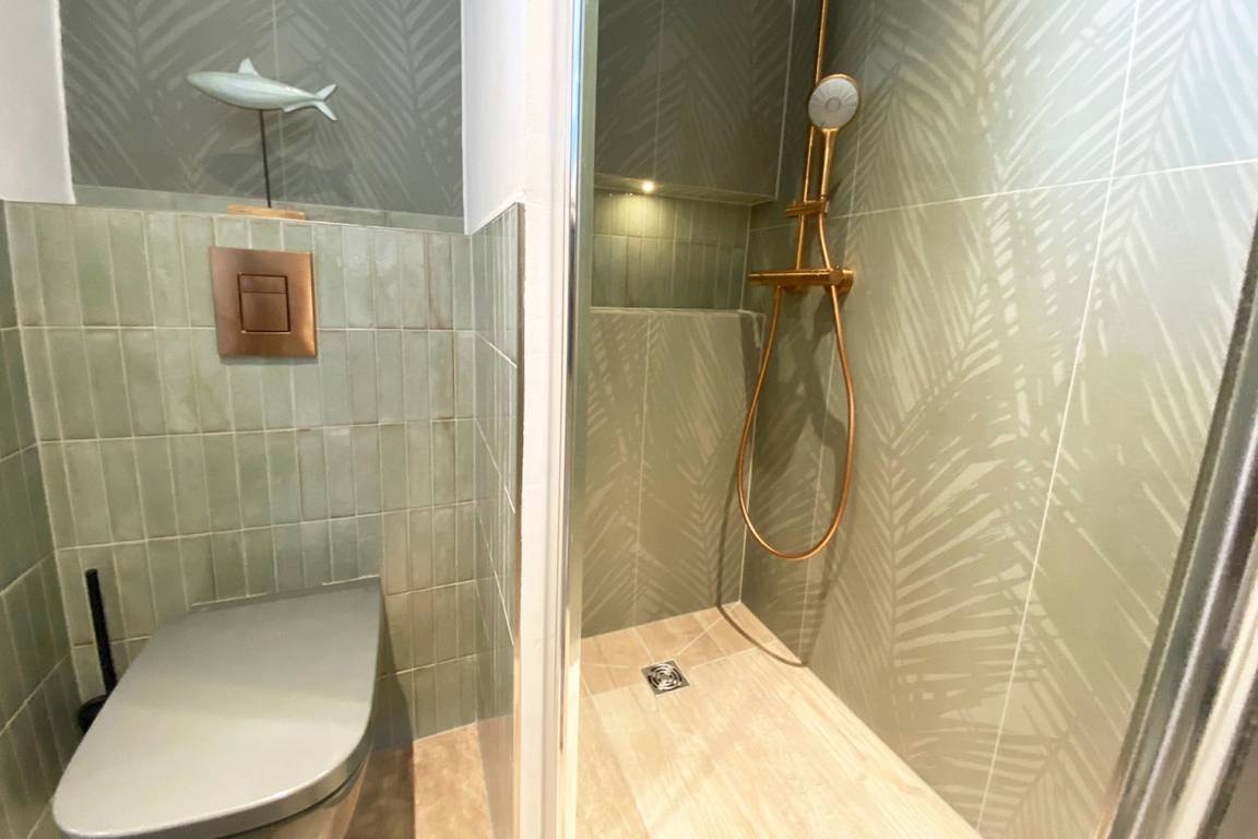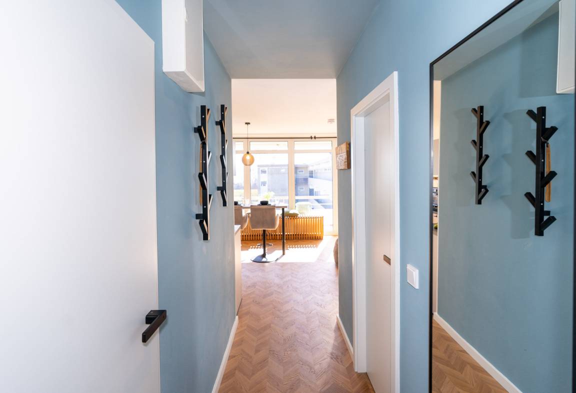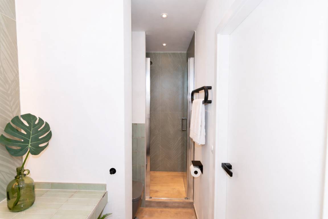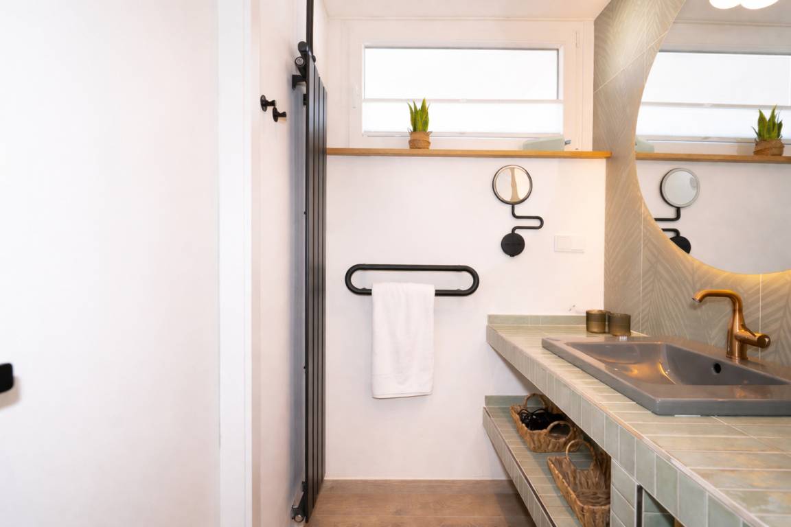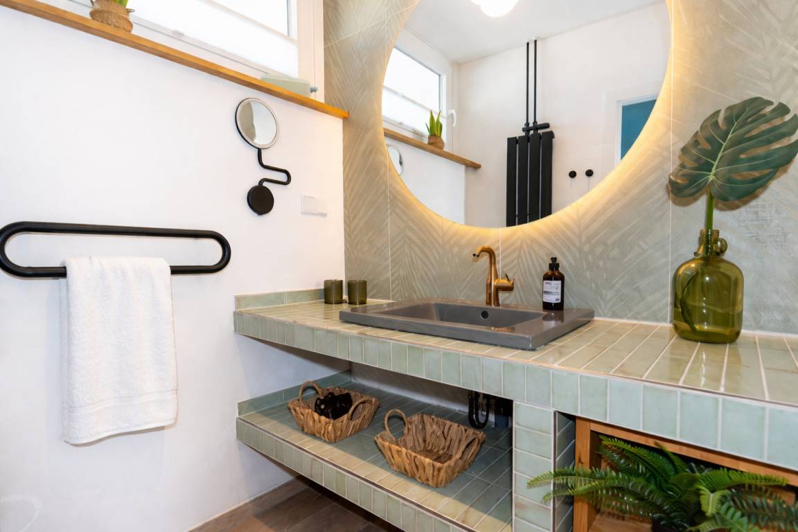 Das ebenfalls rundum erneuerte Duschbad mit Tageslicht bietet einen großen Waschtisch mit vielen Ablagemöglichkeiten, ein Hänge-WC sowie eine Regendusche und einen Handtuchheizkörper.