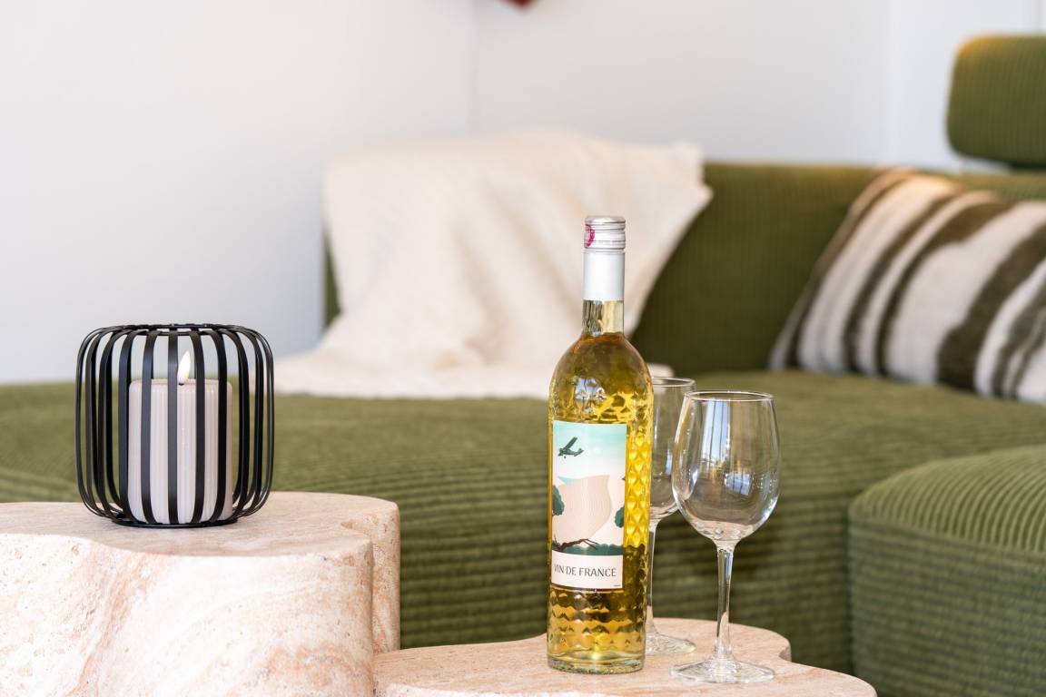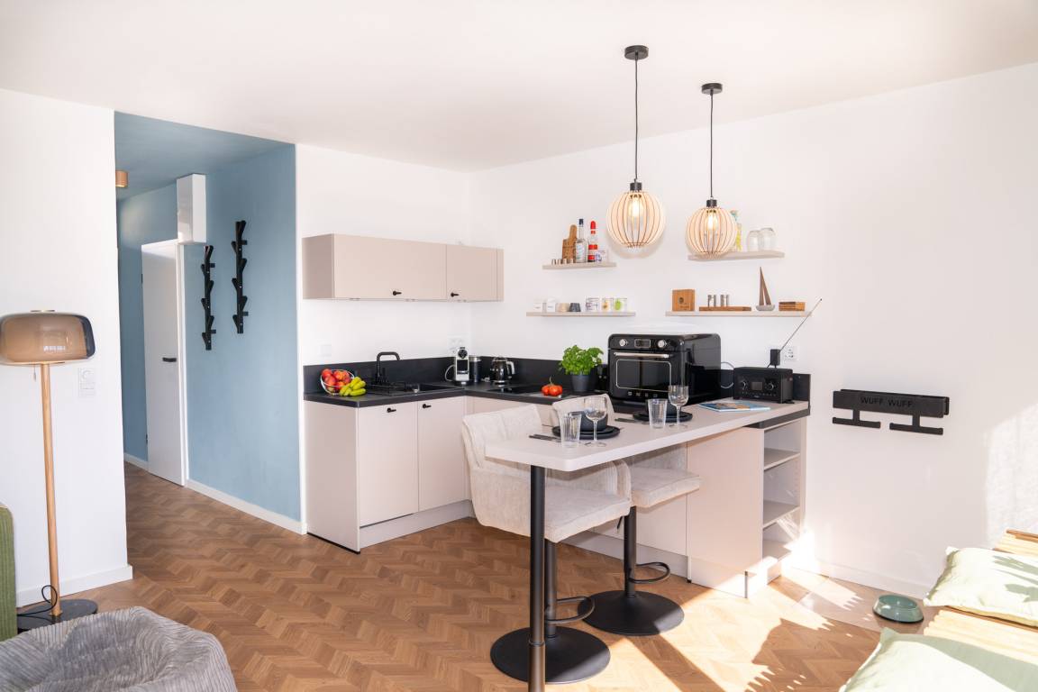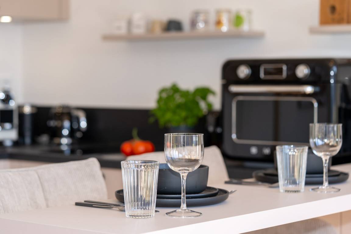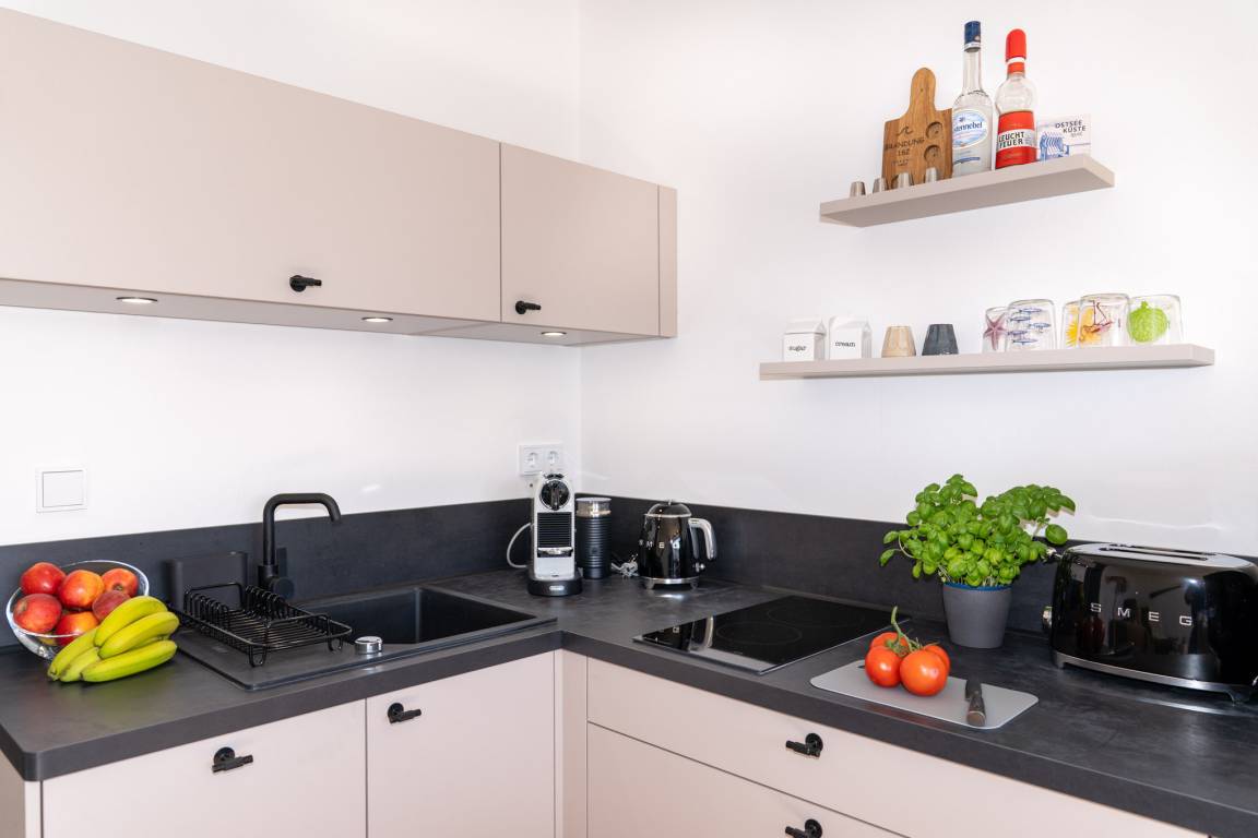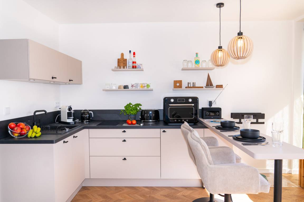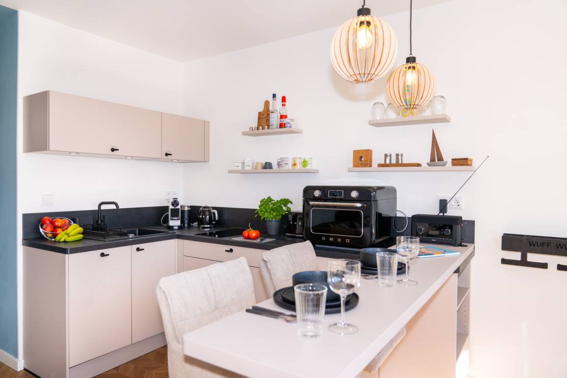 Die voll ausgestattete Küche mit Frühstückstresen, Kühlschrank mit Gefrierfach, Kaffeemaschine (Filter und Kapsel), Wasserkocher und Toaster, sowie ein Backofen mit Airfryer-Funktion bieten alles für den kulinarischen Genuss.