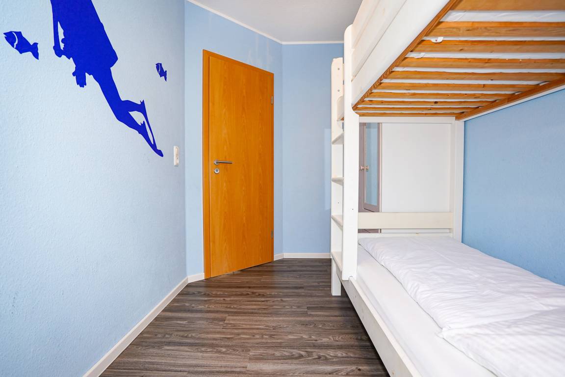 Das Hauptschlafzimmer im 1.OG verfügt über ein Doppelbett (2x90x200cm), einen Fernseher und einen großen Kleiderschrank. Die bodentiefen Fenster lassen bereits zum Morgen die ersten Sonnenstrahlen rein. Ein zweites Schlafzimmer ist mit zwei Einzelbetten und ebenfalls einem Kleiderschrank ausgestattet. Im dritten Schlafzimmer finden Sie ein Hochbett sowie einen Kleiderschrank vor. Alle Fenster lassen sich durch Rollos verdunkeln.