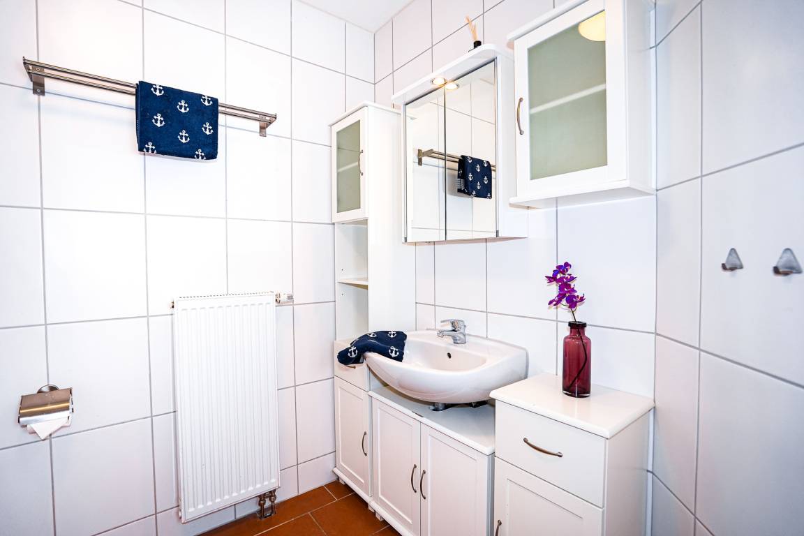 Ergänzt wird das erste Obergeschoss durch ein helles Badezimmer mit einer Eckdusche.