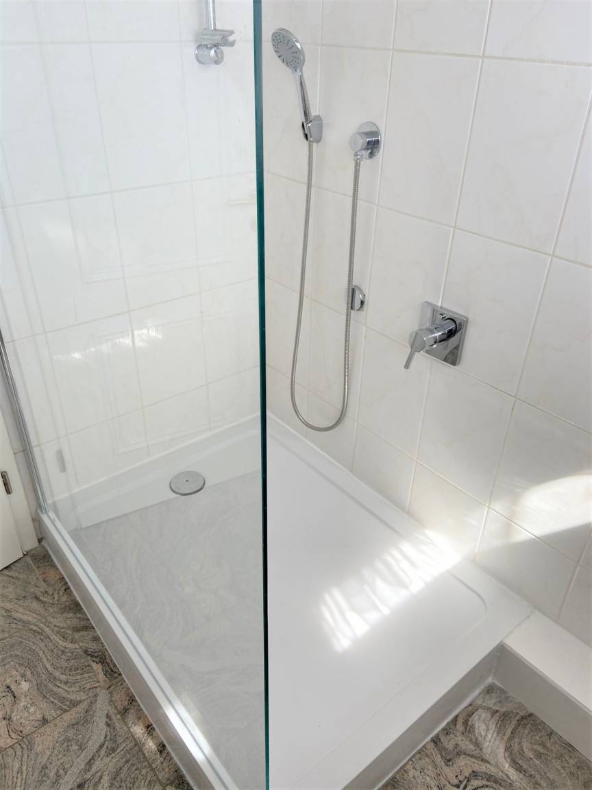 Das helle Duschbad ist mit einer Dusche, Waschbecken Fenster und WC ausgestattet.