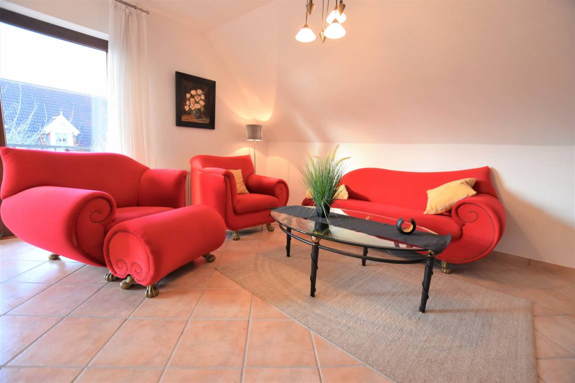 Der Wohnraum ist gemütlich eingerichtet mit einer Couchgarnitur, Schrankwand, Essplatz für 4 Personen, SAT-TV, Radio & hat Zugang zum möblierten Süd-Balkon mit Markise.