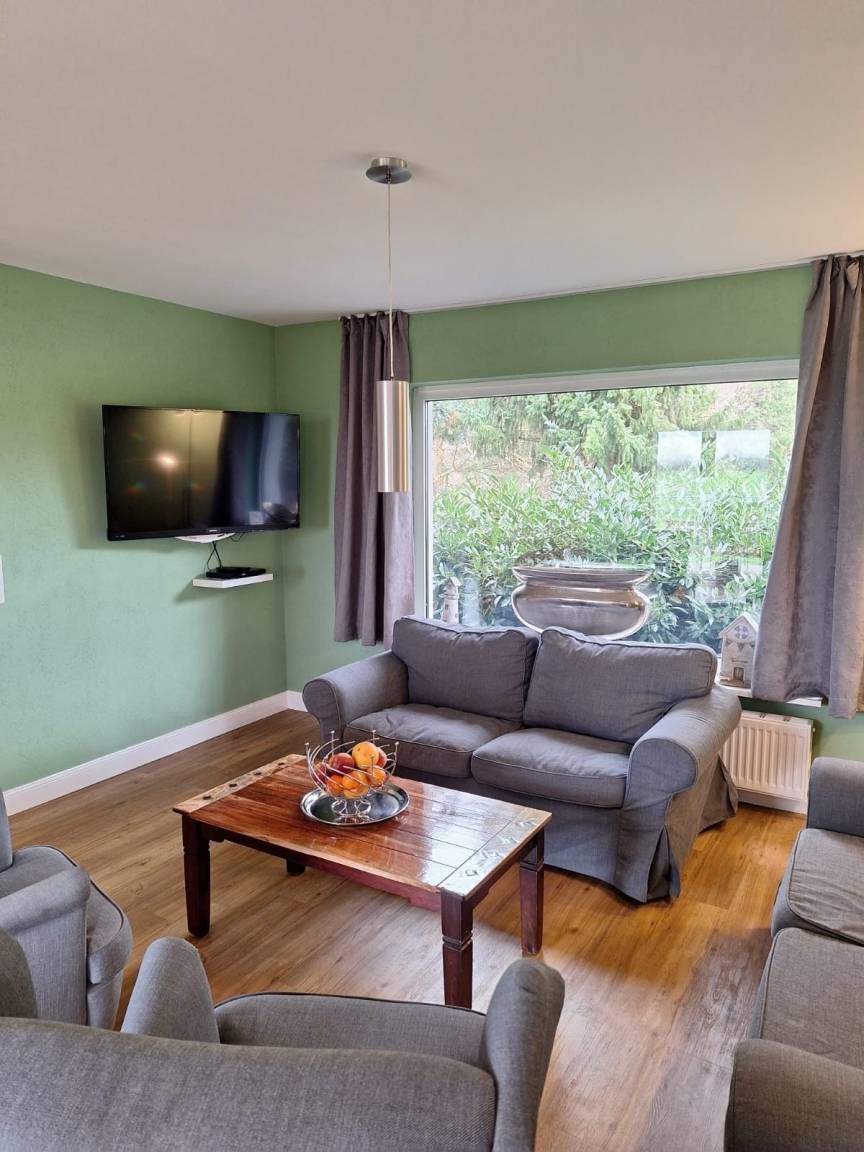 Die Küche ist komplett eingerichtet mit Mikrowelle, Backofen und Spülmaschine uvm.. Auch das Wohnzimmer bietet mit Sat-TV, DVD-Player sowie WLAN moderne Bequemlichkeit.