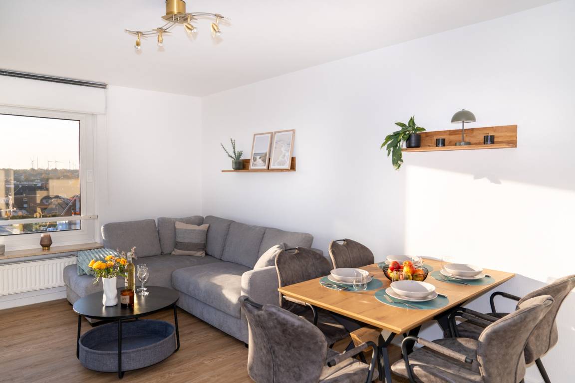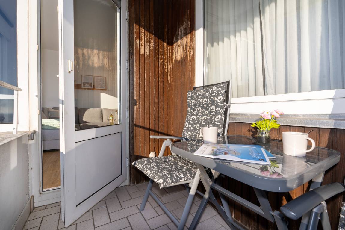 Entspannen Sie nach einem Tag am Strand auf Ihrem nach Süd-Westen ausgerichteten Balkon oder auf dem Sofa mit Blick auf die Ostsee durch die großen Fenster.