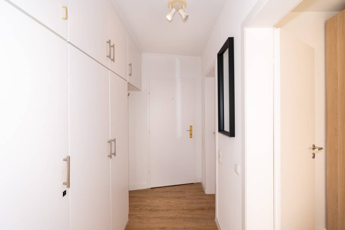 Das lichtdurchflutete Wohnzimmer wurde vollständig mit neuen Möbeln und einem neuen Fussboden ausgestattet. Es verfügt über eine große Eckschlafcouch, einen Esstisch für fünf Personen und einen großen Fernseher. Im ebenfalls neu möblierten Schlafzimmer finden Sie ein Doppelbett mit hochwertigen Matratzen (180 x 200cm), zwei Nachttische und einen Kleiderschrank vor. Weitere Ablagemöglichkeiten befinden sich in den geräumigen Wandschränken im Flur der Wohnung.