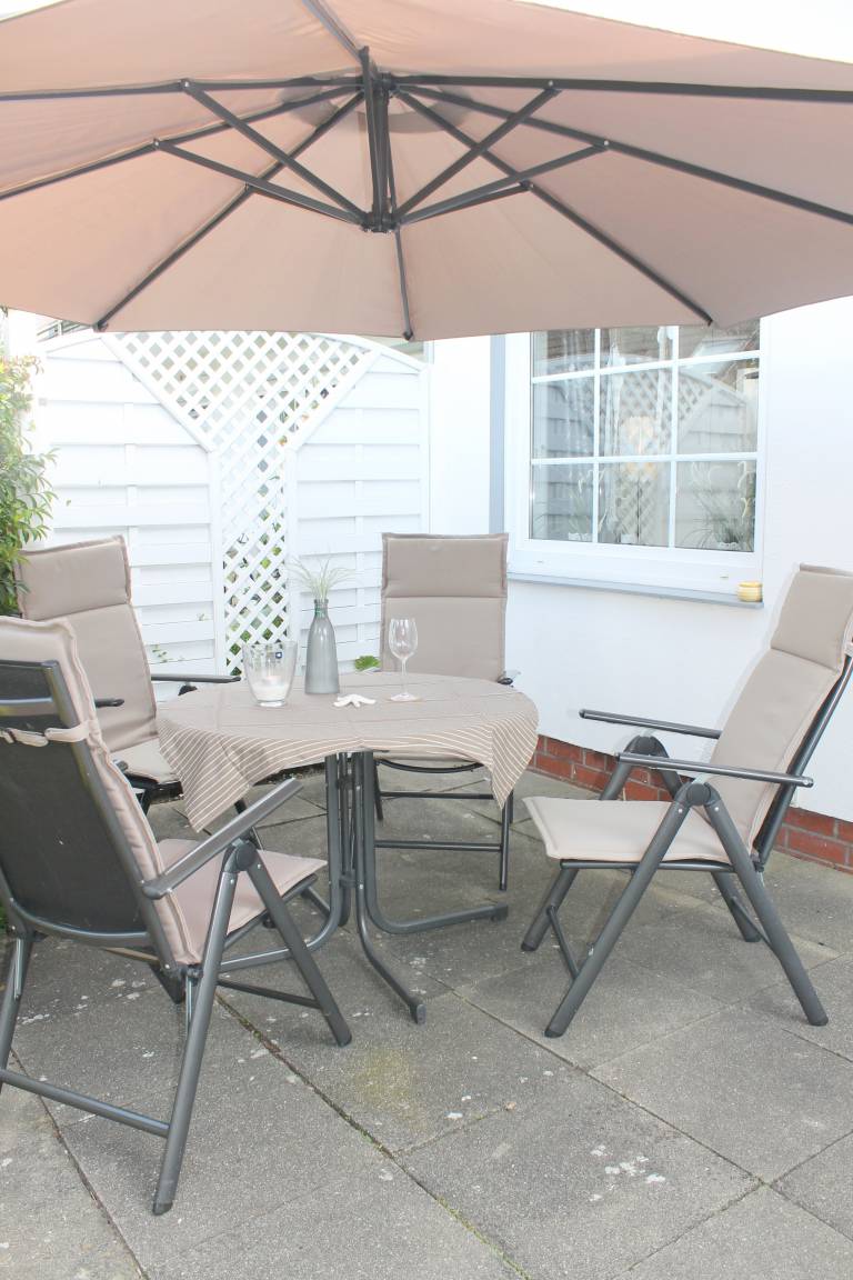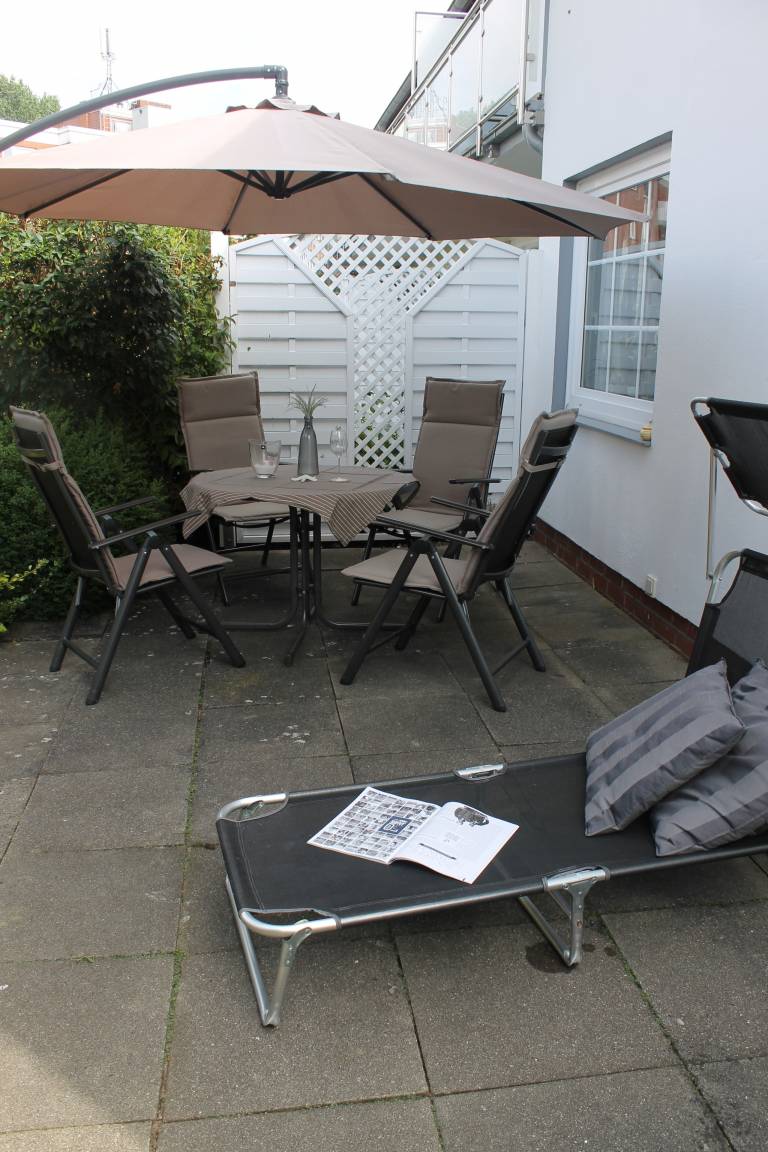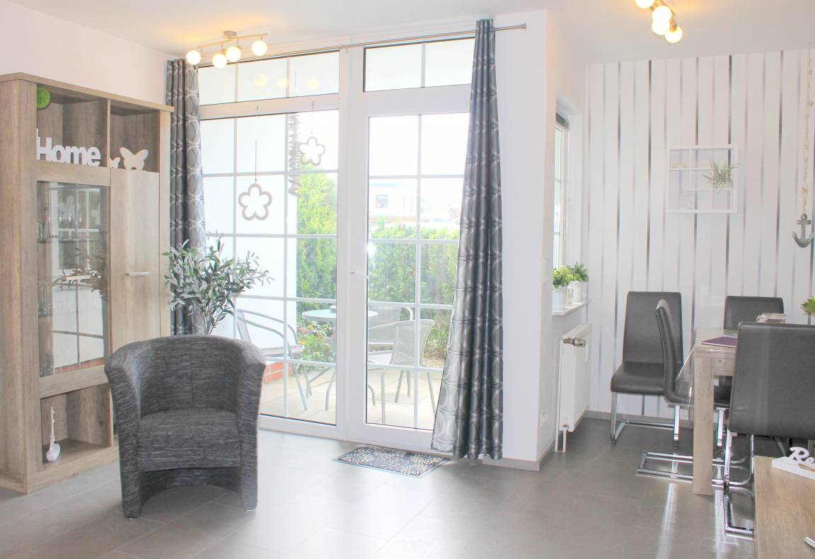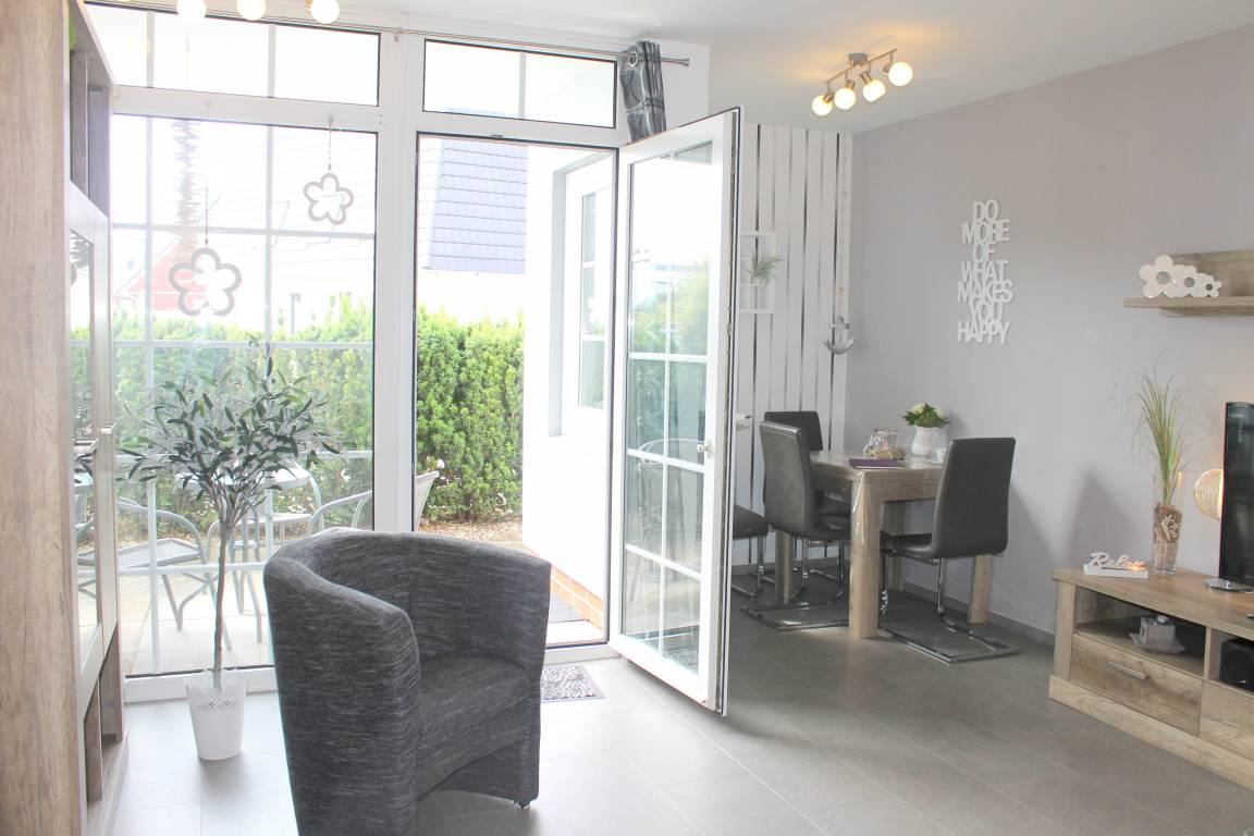 Die Wohnfläche der ca. 43 m ² großen Unterkunft verteilt sich auf ein Wohn- / Esszimmer, einen kleinen Flur, eine separate Küche sowie auf ein Schlafzimmer und auf ein Badezimmer. Der Wohnbereich ist mit einer gemütlichen Couchgarnitur (Schlafmöglichkeit auf der Schlafcouch 1,60x2 m für einen Erwachsenen oder zwei Kinder), Essplatz mit vier Stühlen und einem Flachbild-TV versehen. Von hier aus gelangen Sie auf die erste kleine möblierte Terrasse. Um die Hausecke herum finden Sie die zweite möblierte große Terrasse, eine Sonnenliege sowie ein Sonnenschirm sind hier vorhanden. Auf den beiden Terrassen darf gern geraucht werden, ebenso ist Grillen erlaubt, für mitgebrachte E-Grills steht eine Außensteckdose zur Verfügung. Das separate Schlafzimmer ist mit einem Doppelbett (getrennte Matratzen, offenes Fußende, Maße: 1,80 x 2,00 m) und einem Kleiderschrank versehen. Die separate Küche ist u.a. mit 2er Ceranfeldherd, einem Backofen, einer Geschirrspülmaschine sowie weiteren Küchengeräten versehen. Das Badezimmer verfügt über einen Waschtisch, Dusche und WC. Im Flur der Unterkunft befindet sich eine Garderobe, von hier aus gelangen Sie in alle Räume. Während der Saison (15.04. bis Mitte September) steht Ihnen am Strand ein kostenloser Strandkorb beim Strandkorbvermieter Schwardt/gegenüber Eiscafe Lacrema zur Verfügung.