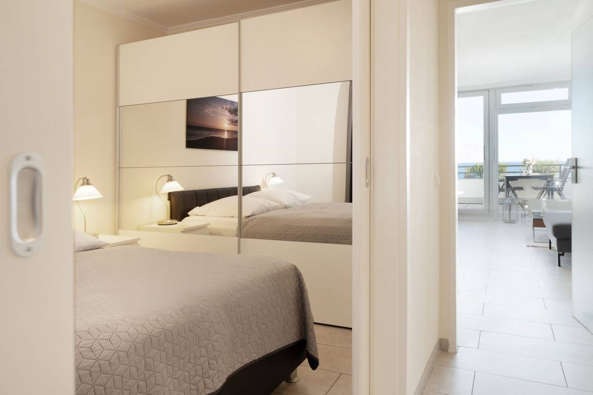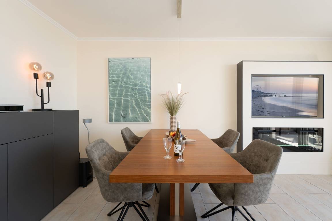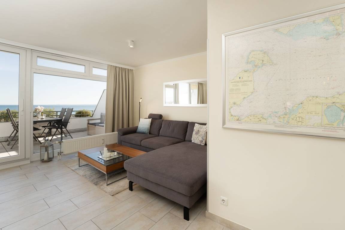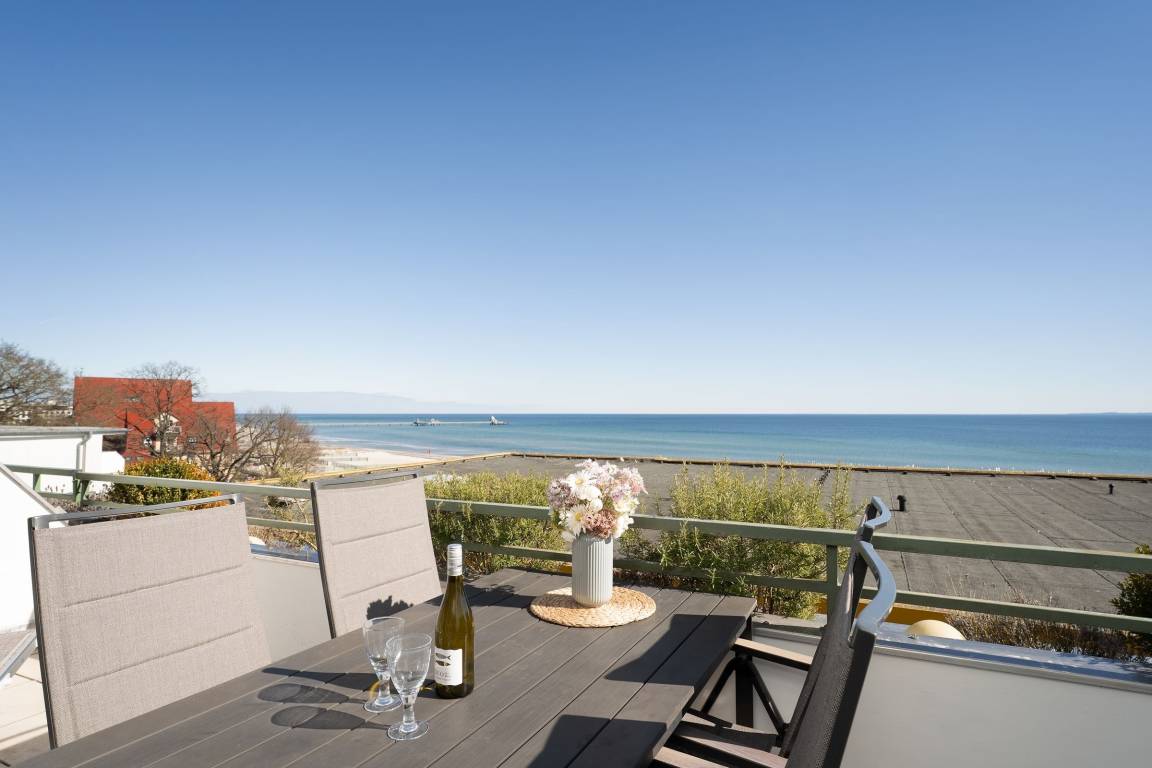Auf dem ca. 16 m² großem Balkon mit Südostausrichtung finden Sie bequeme Sonnenliegen vor, auf denen Sie sich bei guter Seeluft und Meerblick entspannen können. Sie können den Seeblick vom Sofa auf die Ostsee und Seebrücke genießen. Das großzügig geschnittene Wohnzimmer mit gemütlicher Rundcouchecke, großem Smart-TV und Elektrokamin bietet die perfekte Kulisse. Dank extra schnellem High-Speed-WLAN wird es auch an Regentagen nie langweilig. In der gut ausgestatteten, separaten Küche mit Nespresso Kapselmaschine für leckeren Kaffee lassen sich leckere Gerichte zaubern. Das Schlafzimmer mit Doppelbett (2x 90x200 cm) mit eigenem TV ist mit verdunkelnder Gardine ausgestattet. Vom Essbereich mit großem, ausziehbaren Esstisch können Sie ebenfalls den traumhaften Blick auf das Wasser genießen. Das innenliegende, moderne Badezimmer verfügt über eine Dusche sowie ausreichend Stauraum für Ihre Badutensilien. Der Fußboden der gesamten Wohnung ist mit Fliesen ausgelegt. Das Wäscheset ist in dieser Unterkunft für Sie inklusive!