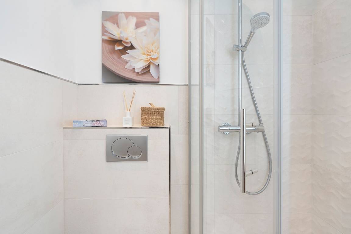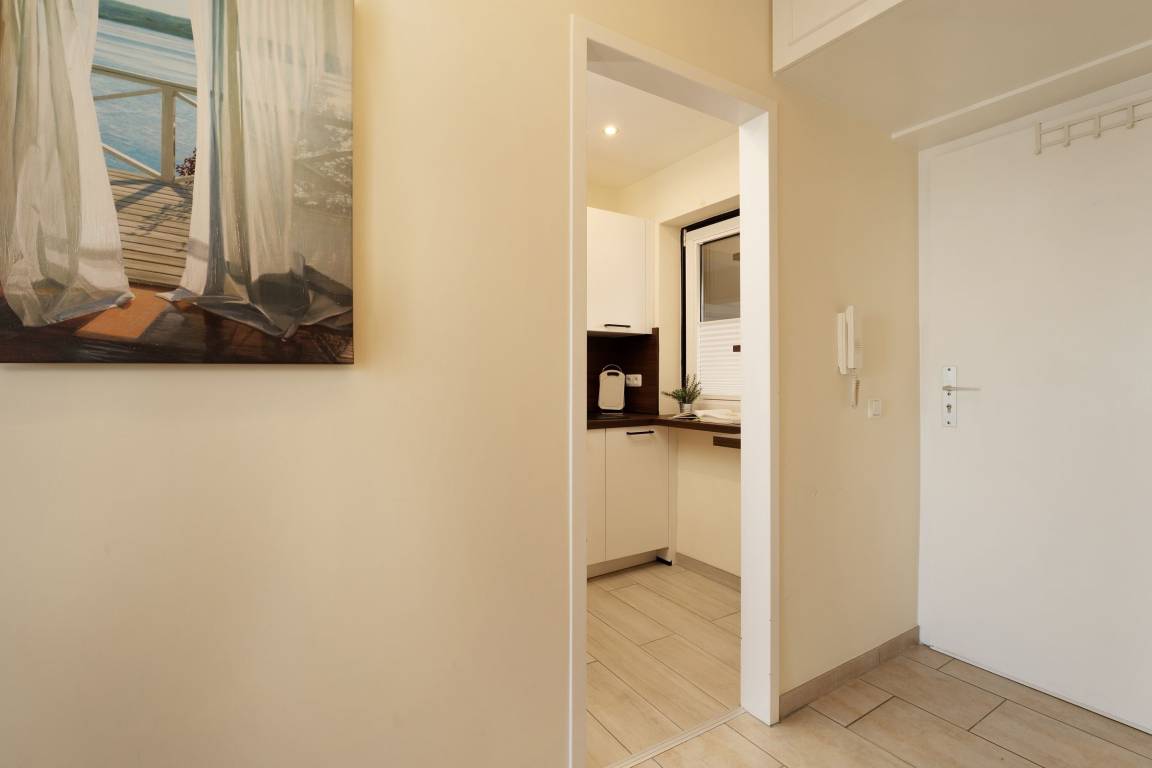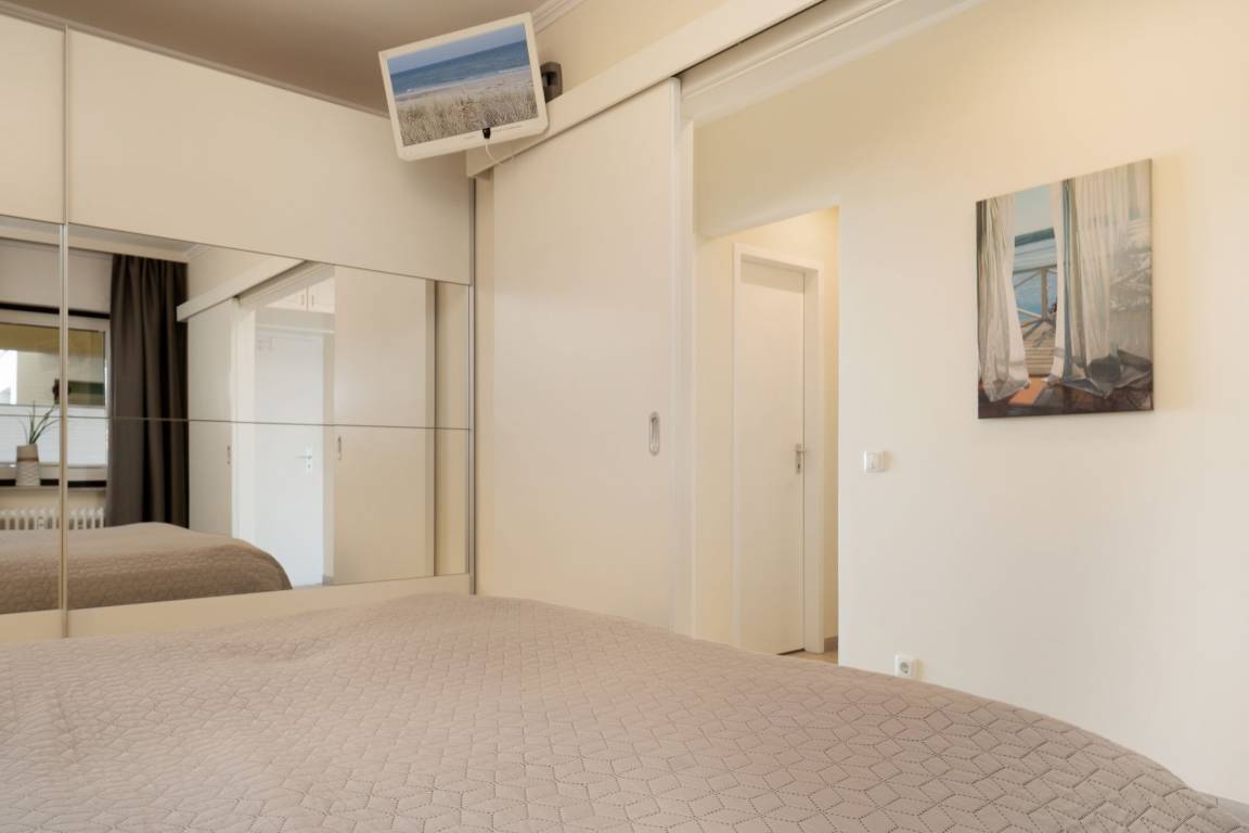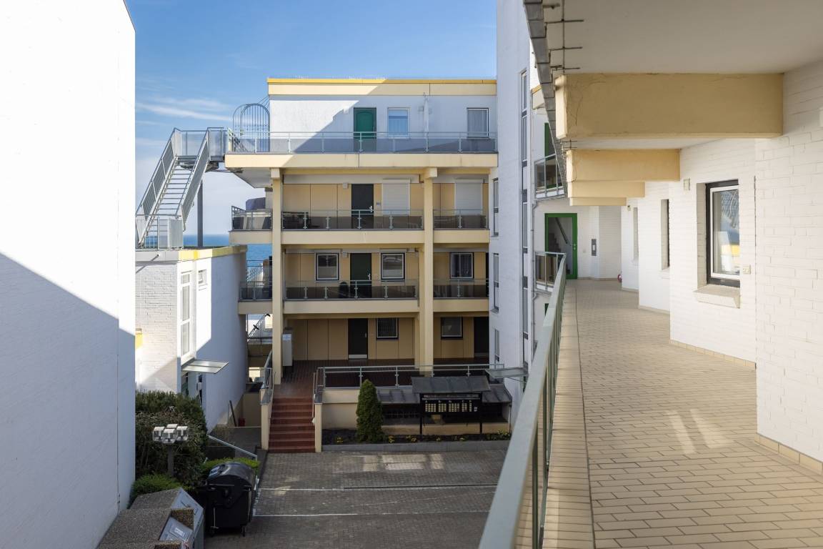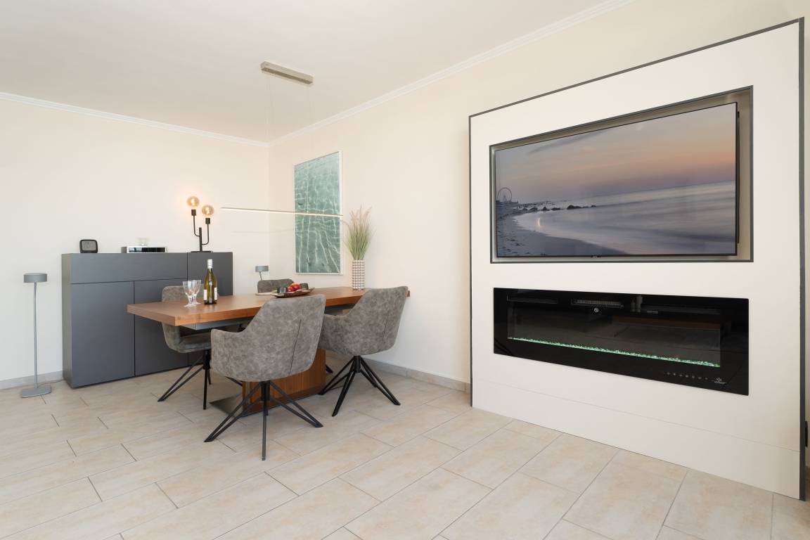 Auf dem ca. 16 m² großem Balkon mit Südostausrichtung finden Sie bequeme Sonnenliegen vor, auf denen Sie sich bei guter Seeluft und Meerblick entspannen können. Sie können den Seeblick vom Sofa auf die Ostsee und Seebrücke genießen. Das großzügig geschnittene Wohnzimmer mit gemütlicher Rundcouchecke, großem Smart-TV und Elektrokamin bietet die perfekte Kulisse. Dank extra schnellem High-Speed-WLAN wird es auch an Regentagen nie langweilig. In der gut ausgestatteten, separaten Küche mit Nespresso Kapselmaschine für leckeren Kaffee lassen sich leckere Gerichte zaubern. Das Schlafzimmer mit Doppelbett (2x 90x200 cm) mit eigenem TV ist mit verdunkelnder Gardine ausgestattet. Vom Essbereich mit großem, ausziehbaren Esstisch können Sie ebenfalls den traumhaften Blick auf das Wasser genießen. Das innenliegende, moderne Badezimmer verfügt über eine Dusche sowie ausreichend Stauraum für Ihre Badutensilien. Der Fußboden der gesamten Wohnung ist mit Fliesen ausgelegt. Das Wäscheset ist in dieser Unterkunft für Sie inklusive!