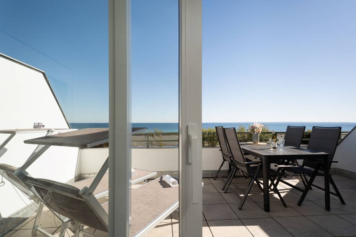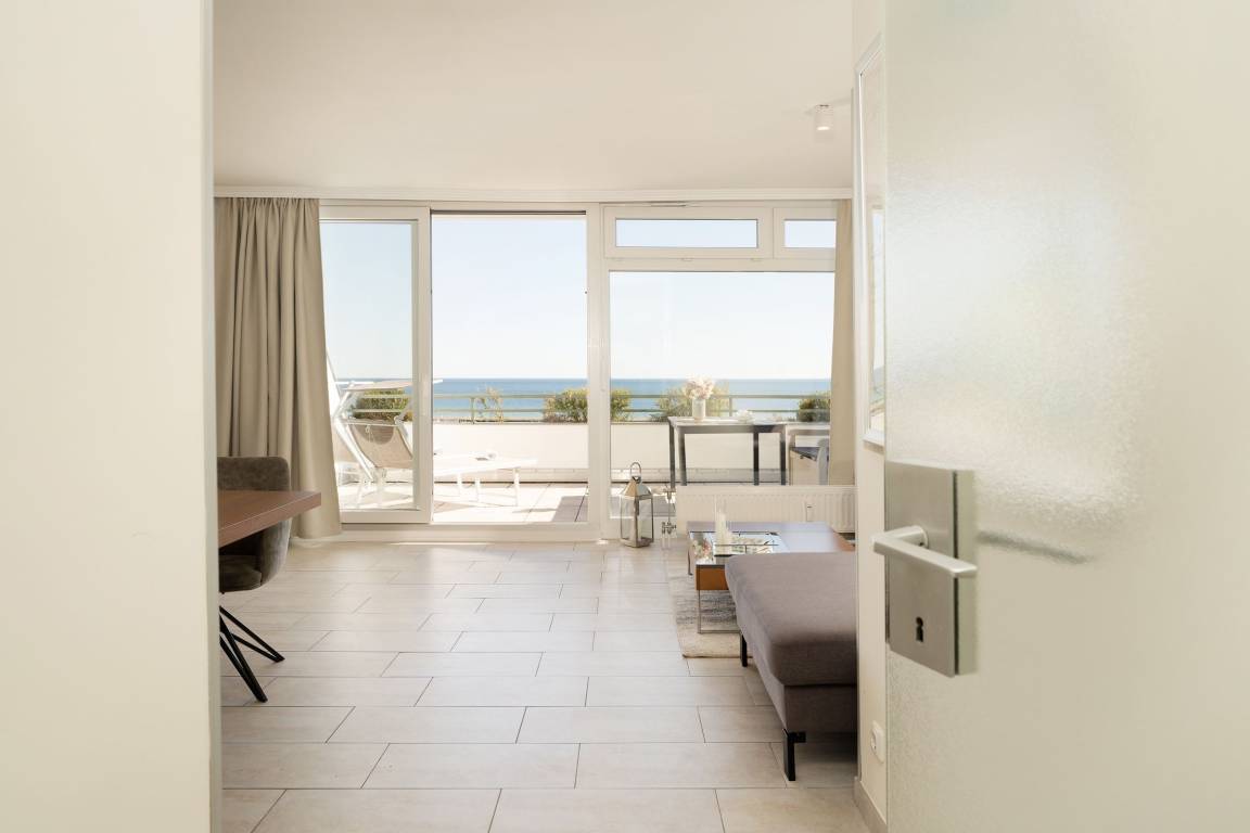 Am Strand von Grömitz: moderne, ca. 60 m² große 2-Zimmer-Ferienwohnung im 5. Stock mit großem Balkon und Meerblick für bis zu 2 Personen.