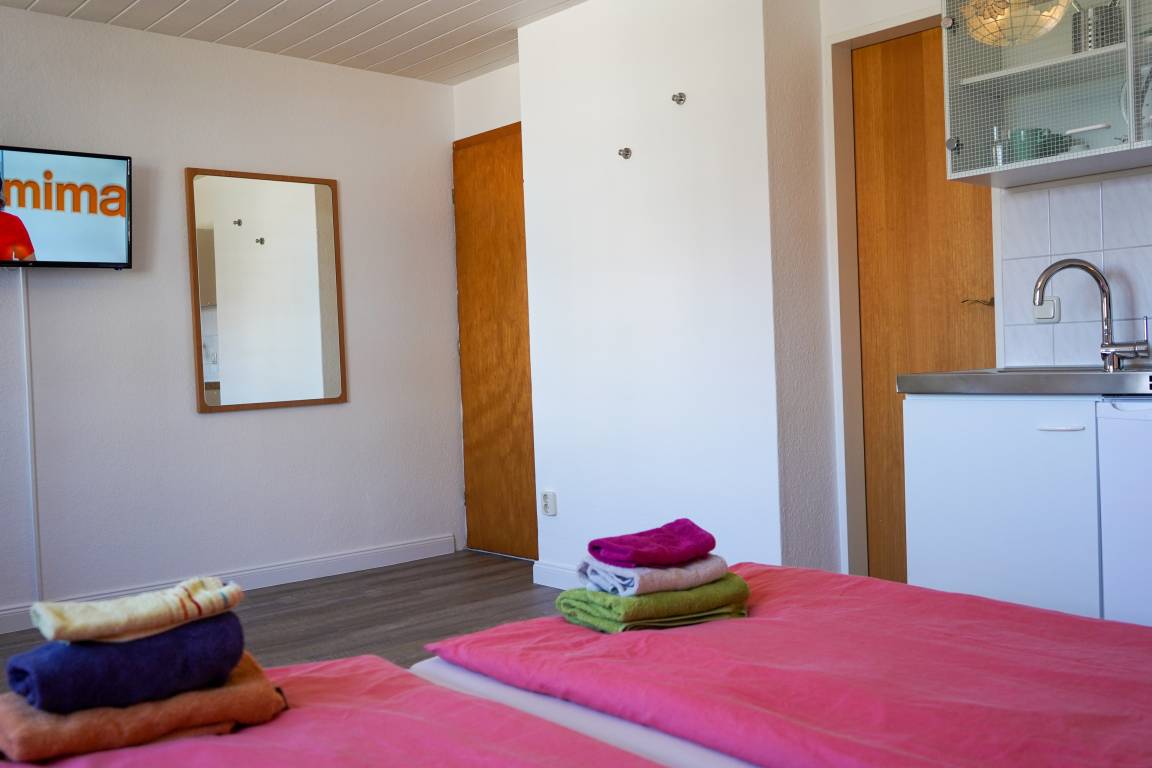 Das Appartement verfügt über eine Pantryküche, ausgestattet mit Kühlschrank, Toaster, Wasserkocher und Mikrowelle, dies ermöglicht es Ihnen, kleine Mahlzeiten zuzubereiten. Das Wohn-/Schlafzimmer ist mit einem gemütlichen Doppelbett, einem TV mit Sat/Kab./DVB-T und einem Balkon/Loggia ausgestattet, auf dem Sie entspannte Stunden verbringen können.