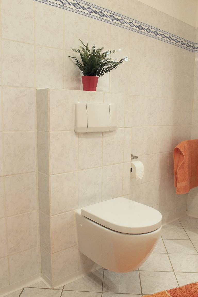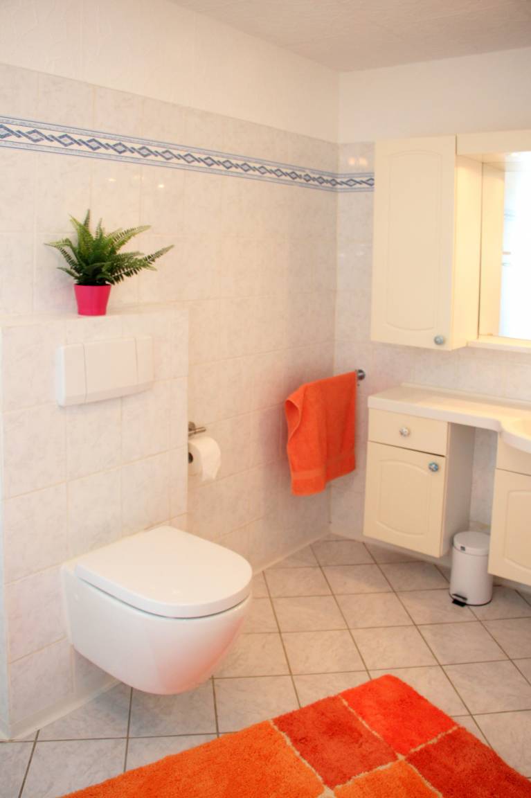 Badezimmer mit Dusche, WC und Waschtisch.