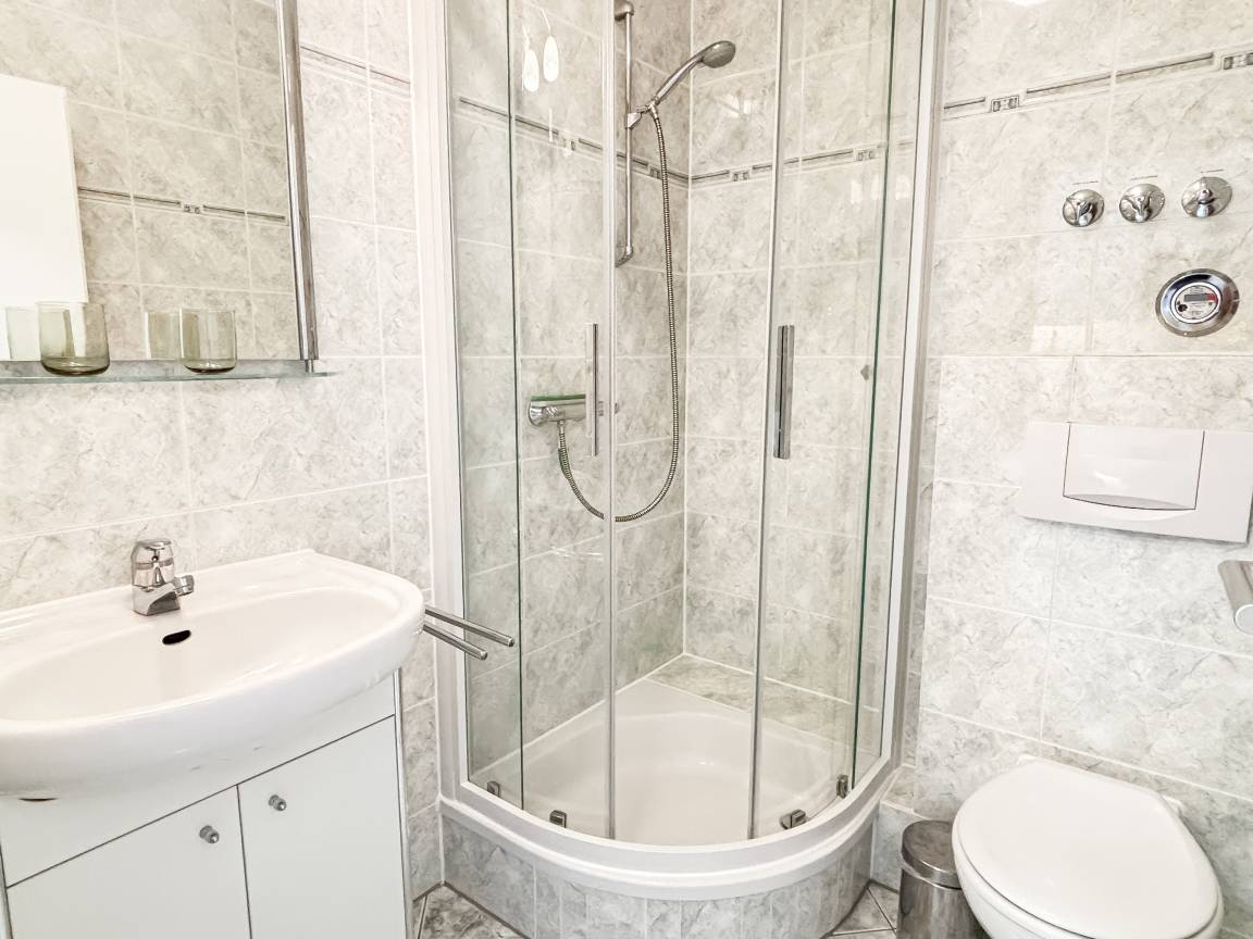 Helles Bad mit Runddusche incl. Glasschiebetür, WC und Waschbecken.