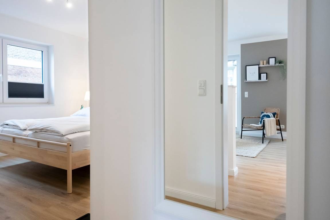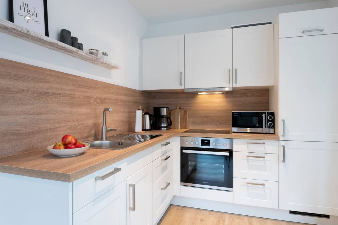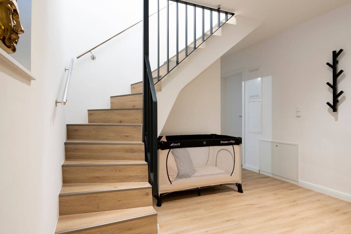 Geradeaus durch den hell und freundlich gestalteten Flur mit Garderobe erreichen Sie das Herzstück dieser Wohnung: den kombinierten Wohn- und Essbereich mit Zugang zum großen, teilüberdachten Balkon mit Süd-West-Ausrichtung. Im Wohnbereich erwartet Sie ein gemütliches Sofa (Liegefläche 140x200 cm), ein Sessel sowie ein Flachbildfernseher. Entspannten Abenden steht hier nichts im Wege! Die angrenzende, offene Küche ist voll ausgestattet und lädt am runden Esstisch zu gemeinsamen Mahlzeiten ein. Das separate Schlafzimmer mit Doppelbett (2x 90x200 cm) ist mit einem Kleiderschrank und einem Fernseher ausgestattet. Auf dieser Ebene befindet sich ein Badezimmer mit WC, Dusche und Waschtisch. Im Souterrain erwartet Sie ein weiteres Zimmer als Rückzugsort mit Sofa, Kleiderschrank und Fernseher. Ein großzügiges Badezimmer mit WC und bodengleicher Dusche sowie eine eigene Sauna (1€ / 20 Minuten) und ein angrenzender Ruheraum mit gemütlichen Schaukelstühlen erwarten Sie ebenfalls im Souterrain.