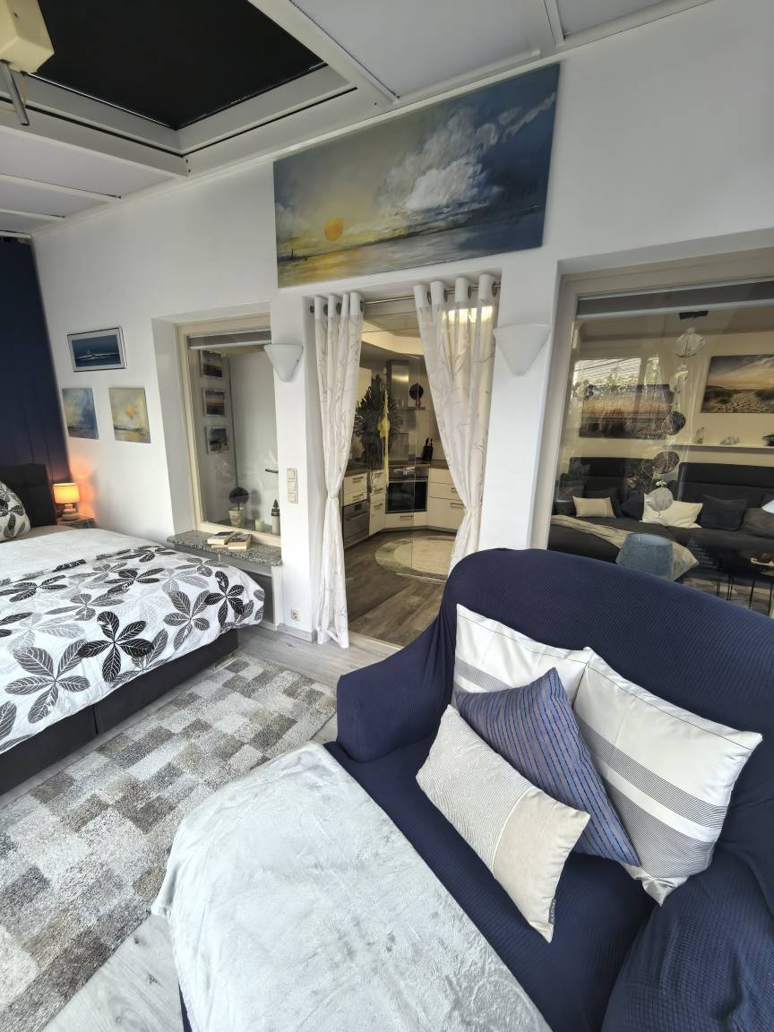 Hier erwartet Sie ein Boxspringbett (160 cm), ausgestattet mit hochwertigen 7-Zonen Bandscheibenmatratzen (2 Härtegrade) + Topper und ein gemütlicher Sessel für die abendliche Lesestunde.