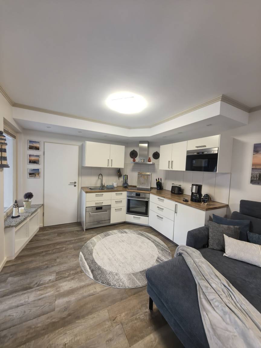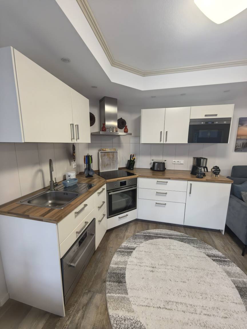 Das Herzstück der Ferienwohnung bildet der liebevoll eingerichtete Wohnbereich mit integrierter gut ausgestatteter Küche, die mit Alltagshelfern wie Ceranfeld, Backofen, Mikrowelle mit Dampfgarrfunktion und Mini-Spülmaschine begeistert.