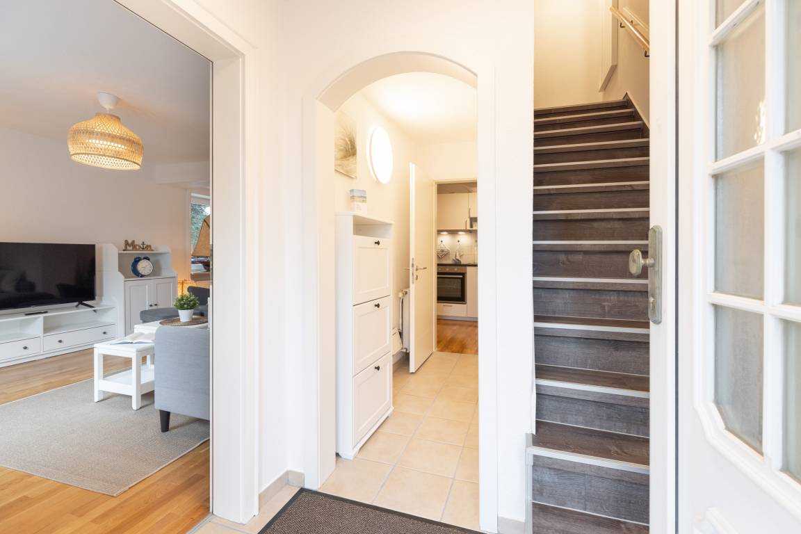 führt in den Wohnraum, die Küche oder über die Treppe ins Obergeschoss, in dem die Schlafräume und das Badezimmer liegen.