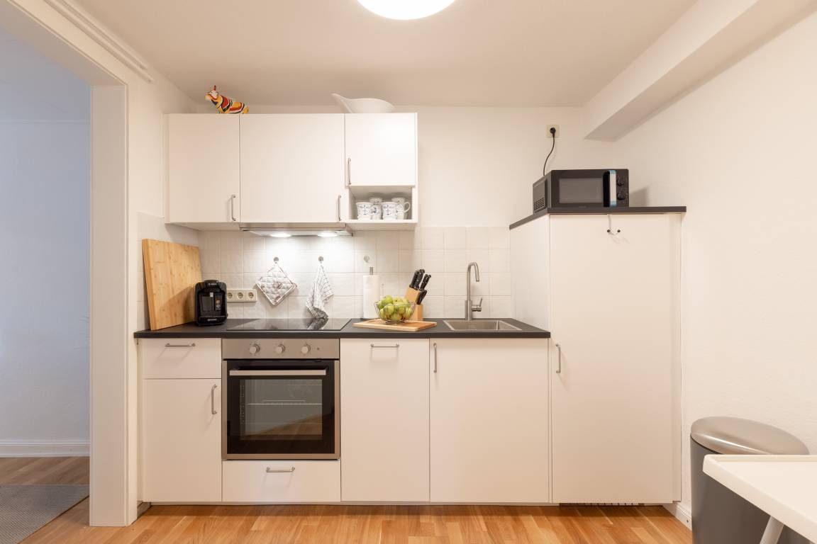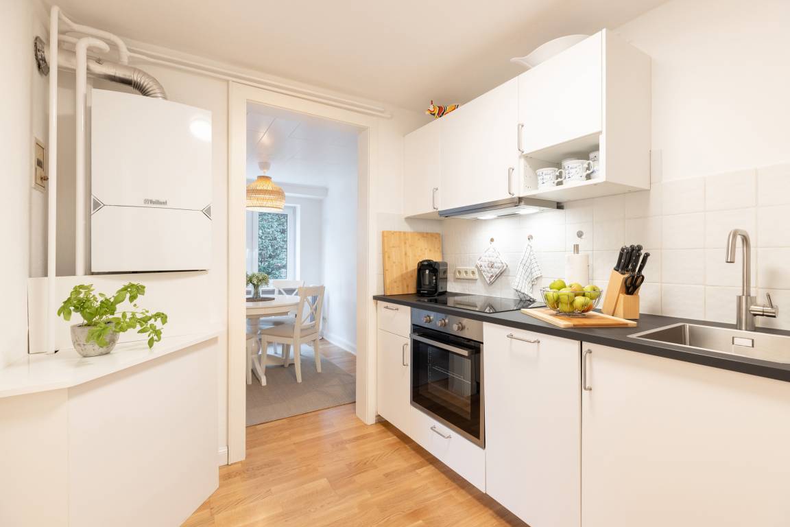 Nebenan befindet sich die Küche mit Induktionskochfeld, Backofen, Mikrowelle, Spülmaschine, Kühlschrank mit Gefrierfach etc. Hier gibt es auch einen kleinen Abstellraum, in dem sich Alltagshelfer wie Staubsauger, Besen oder Bodenwischer sowie auch die Terrassen-Möbel befinden.