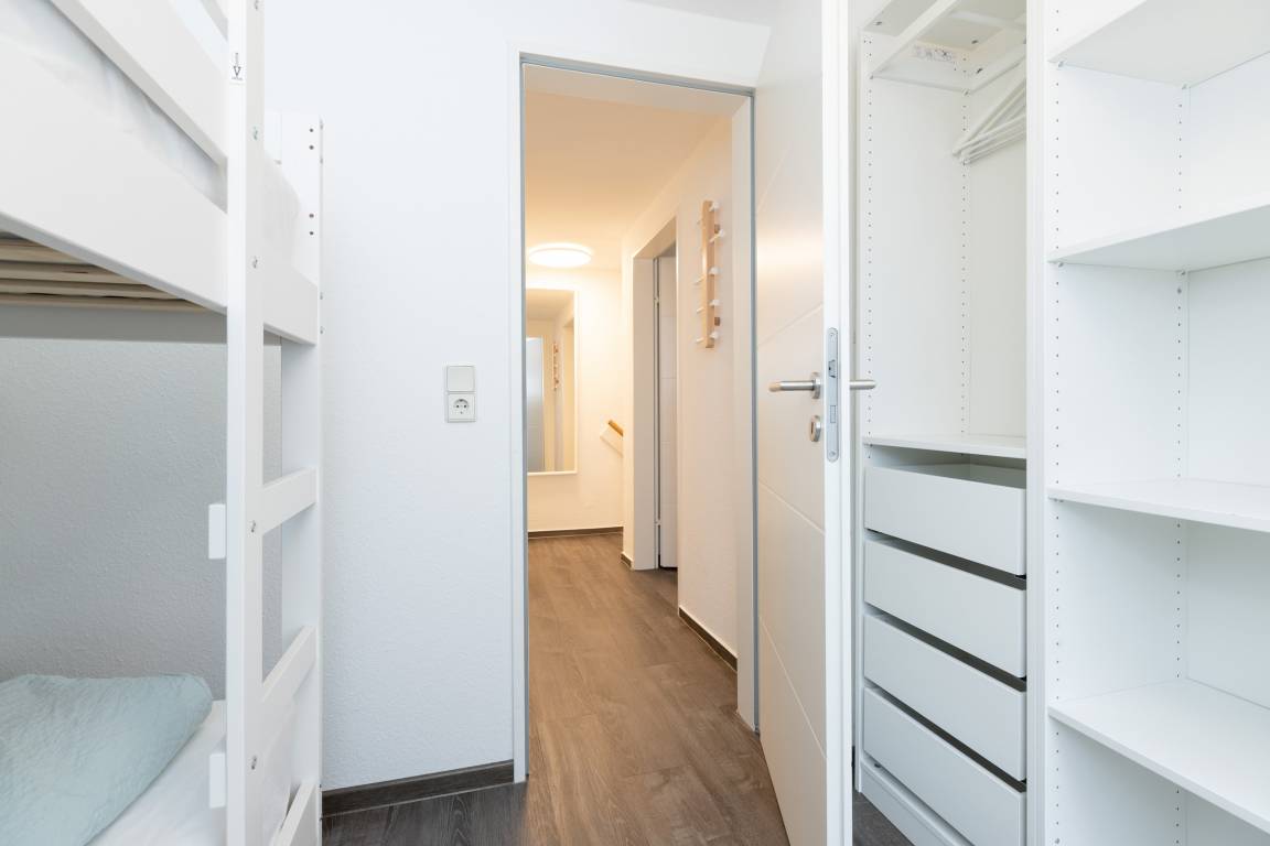 bietet in seinem offenen Kleiderschrank ausreichend Stauraum. Das Etagenbett (2 mal 90x200cm) ist für viele Kids ein Highlight im Urlaub.