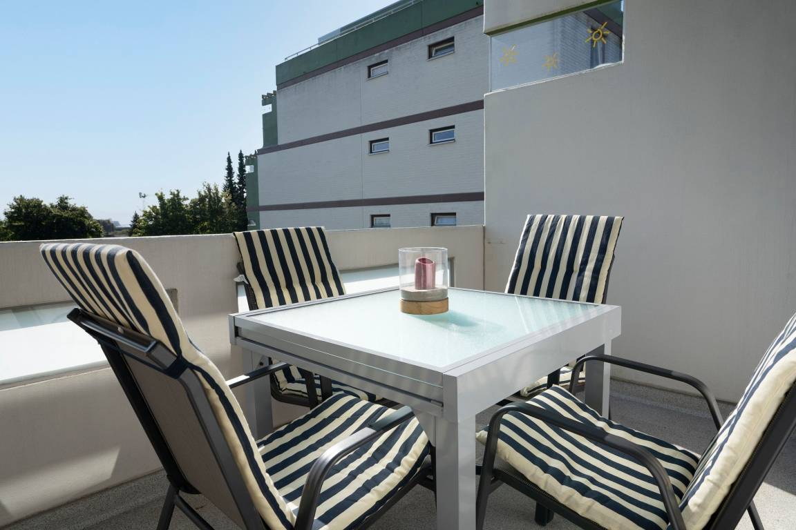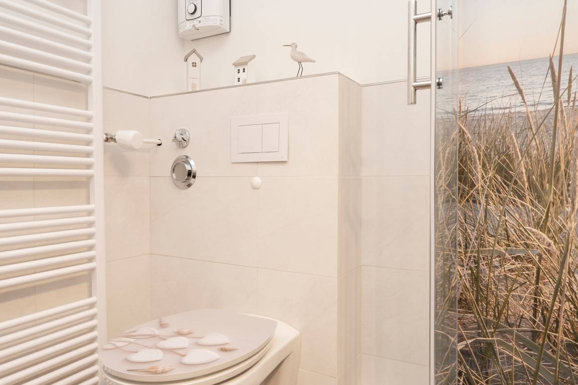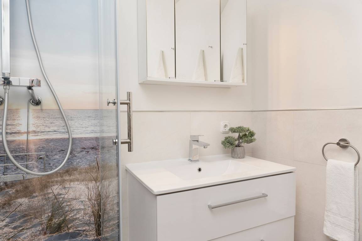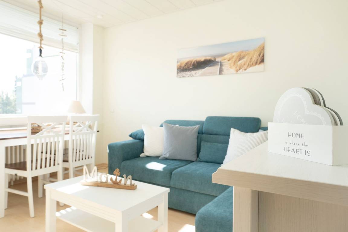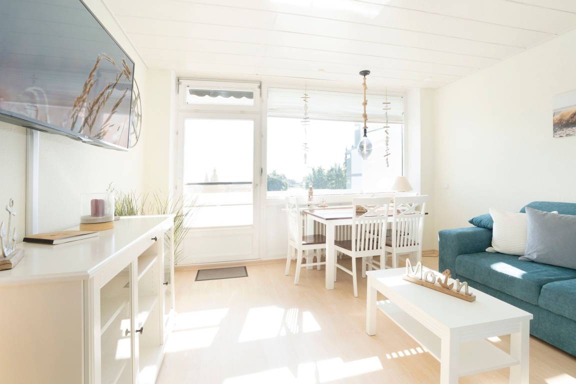 Der Wohnbereich mit einladendem Sofa und Flachbild-TV ist in harmonischen Farben gehalten und lässt keine Wünsche offen. Zur Nacht verwandeln Sie das Sofa in eine gemütliche Schlafstätte für 2 Personen (ca. 150x200 cm). Neben dem Fernsehgerät sorgt ein kostenfreier WLAN-Anschluss zum Streamen Ihrer Lieblingsmusik für Unterhaltung. In der offenen, voll ausgestatteten Küche werden Sie alles finden, was Sie zur Zubereitung leckerer Mahlzeiten benötigen. Gemeinsam essen und spielen können Sie dann am Esstisch mit ausreichend Platz. Von hier aus gelangen Sie auf den möblierten Balkon mit Ostsee-Fernblick, auf dem Sie die Seele baumeln lassen können. Eine Markise spendet Ihnen bei Bedarf Schatten. Ein separates Schlafzimmer mit komfortablem Doppelbett (2x80x200 cm) lädt Sie gleich nebenan zu traumhaften Nächten ein. Das Duschbad mit Föhn komplettiert die Ausstattung dieser tollen Ferienwohnung.