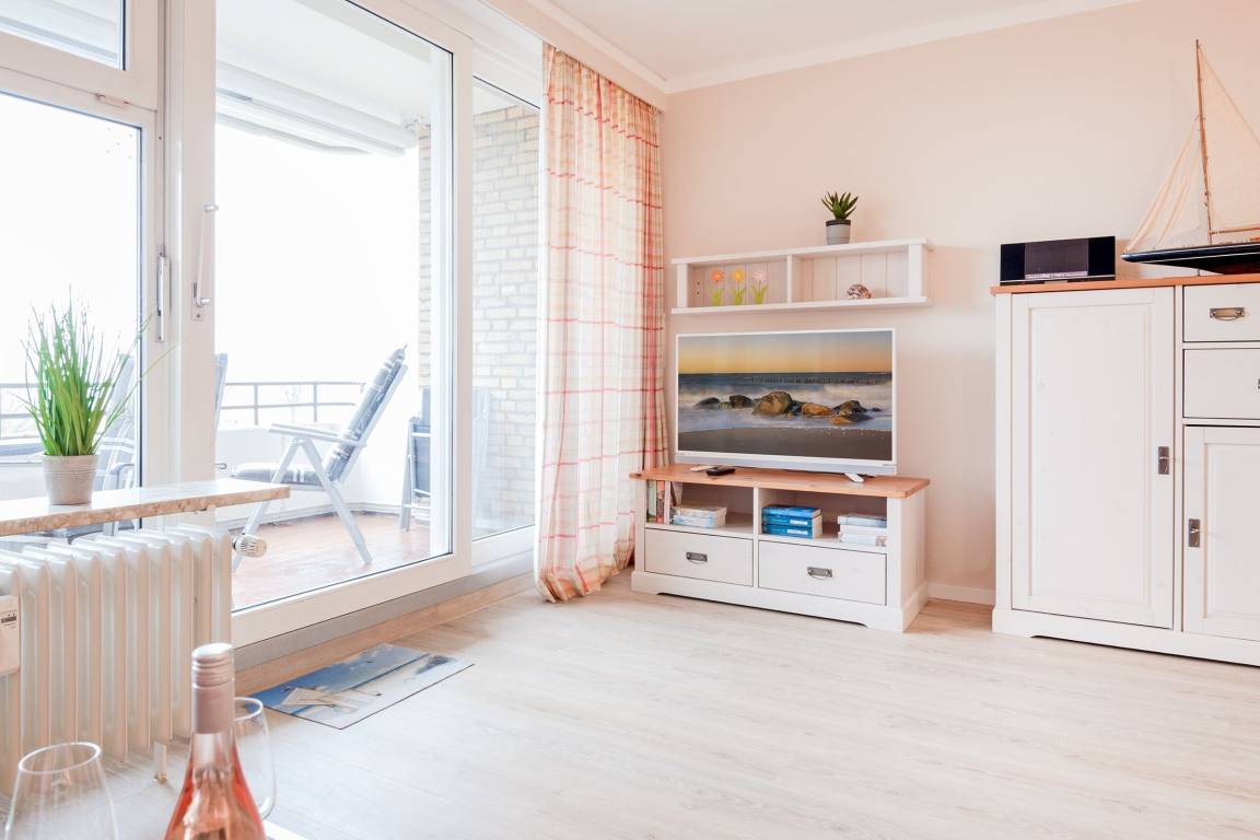 Vom Wohnzimmer mit gemütlicher Couch, TV, sowie CD-Player und Radio gelangen Sie auf den ca. 8m² großen Balkon mit Markise und traumhaftem Meerblick. Hier könnte Ihr Tag mit heißem Kaffee und leckerem Frühstück starten.
