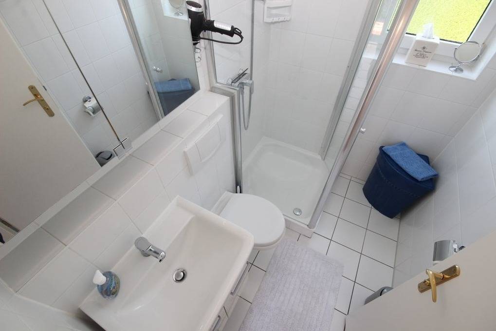 Das helle Bad ist mit Dusche incl. Glastrennwand, WC & Waschbecken ausgestattet.