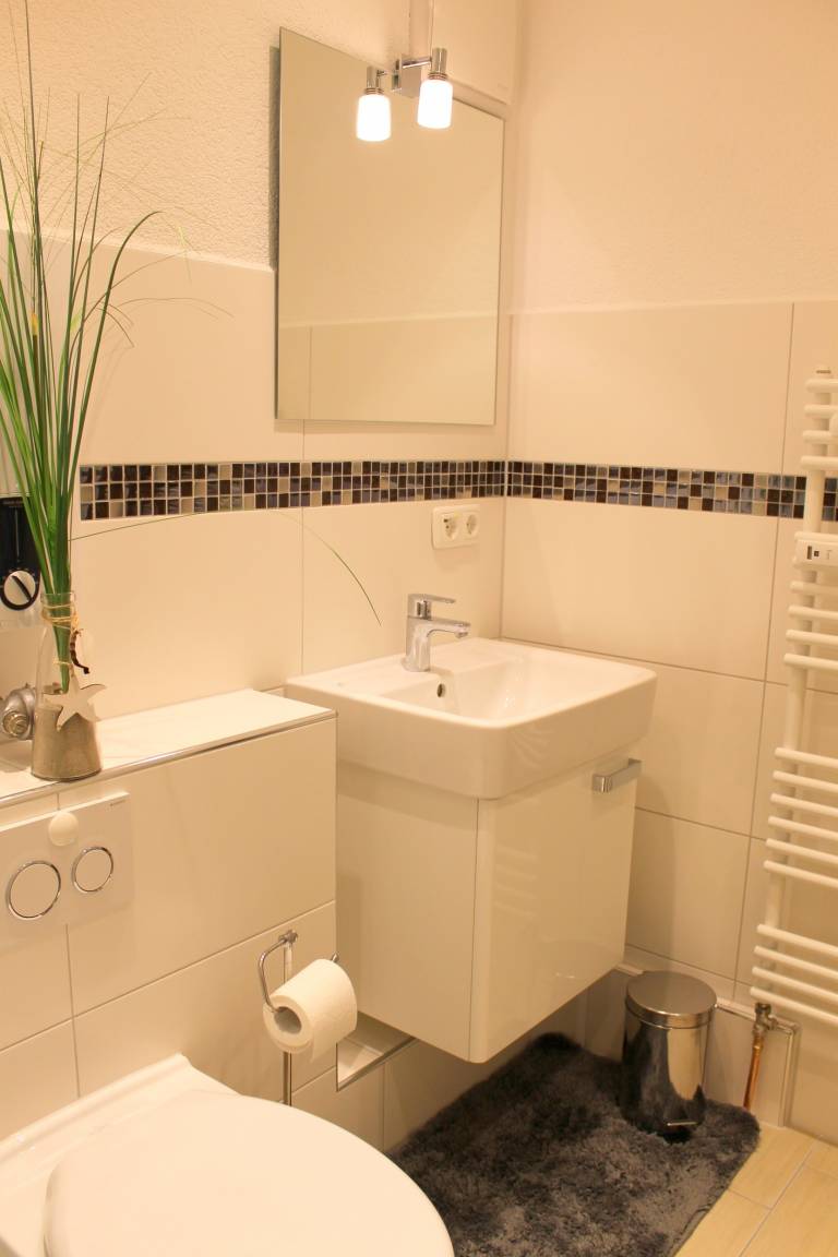 Modernes Bad mit Dusche, WC, Waschbecken & Handtuchheizung