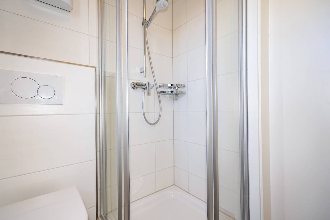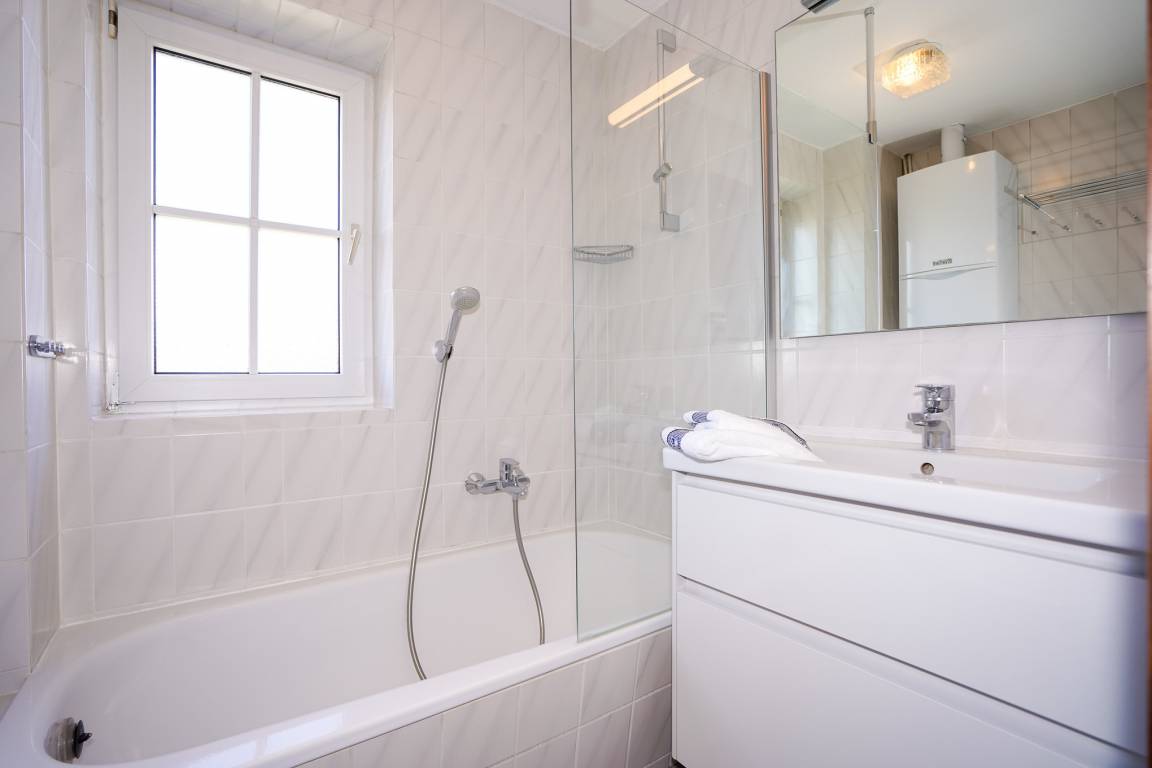 Das Haus verfügt über zwei vollwertige Badezimmer. Das modernisierte hell geflieste Tageslicht-Bad im Erdgeschoss ist mit einer großen Dusche, WC, Waschbecken und einer Waschmaschine ausgestattet. Das zweite Badezimmer im 1. OG ist mit einer Badewanne mit Duschtrennwand, einem WC und einem Waschbecken ausgestattet.