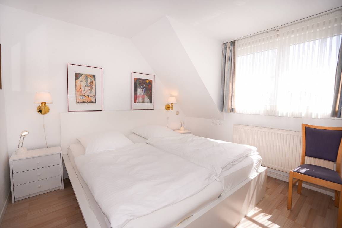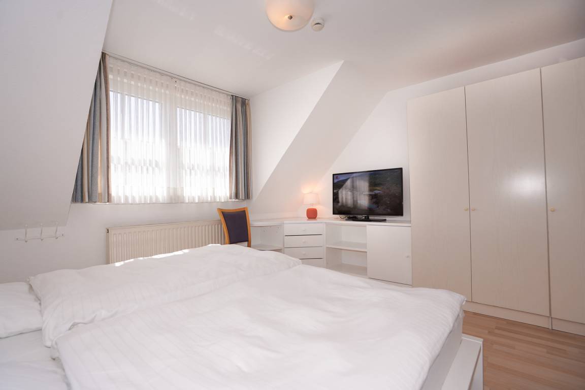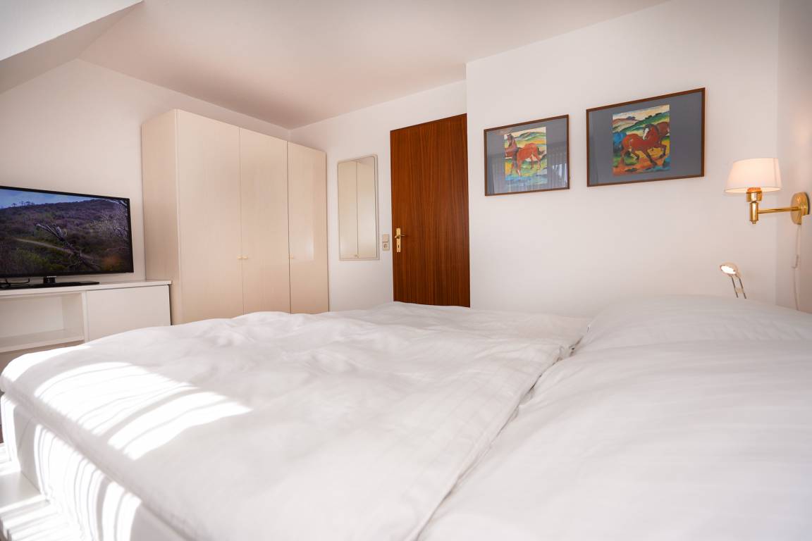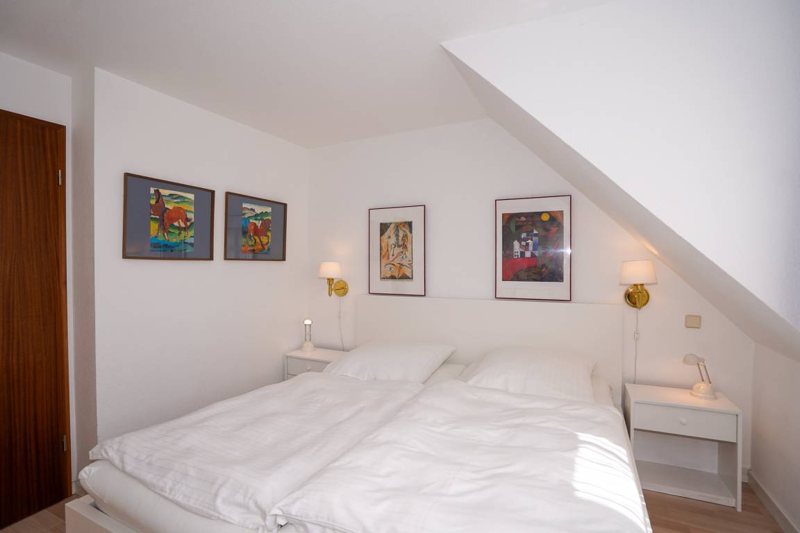 Ein Schlafzimmer im 1.OG verfügt über ein Doppelbett (2x 90x200cm), eine Kommode, einen Kleiderschrank und einen zusätzlichen Fernseher. Das zweite Schlafzimmer befindet sich auf der gleichen Ebene und ist mit einem Doppelbett (2x90x200cm) und einem Kleiderschrank ausgestattet. Beide Schlafzimmer lassen sich durch Vorhänge bzw. Jalousien verdunkeln. Im Dachgeschoss , welches Sie über eine Wendeltreppe erreichen, befinden sich drei weitere Schlafmöglichkeiten. Hier finden Ihre Kinder einen eigenen Rückzugsort.