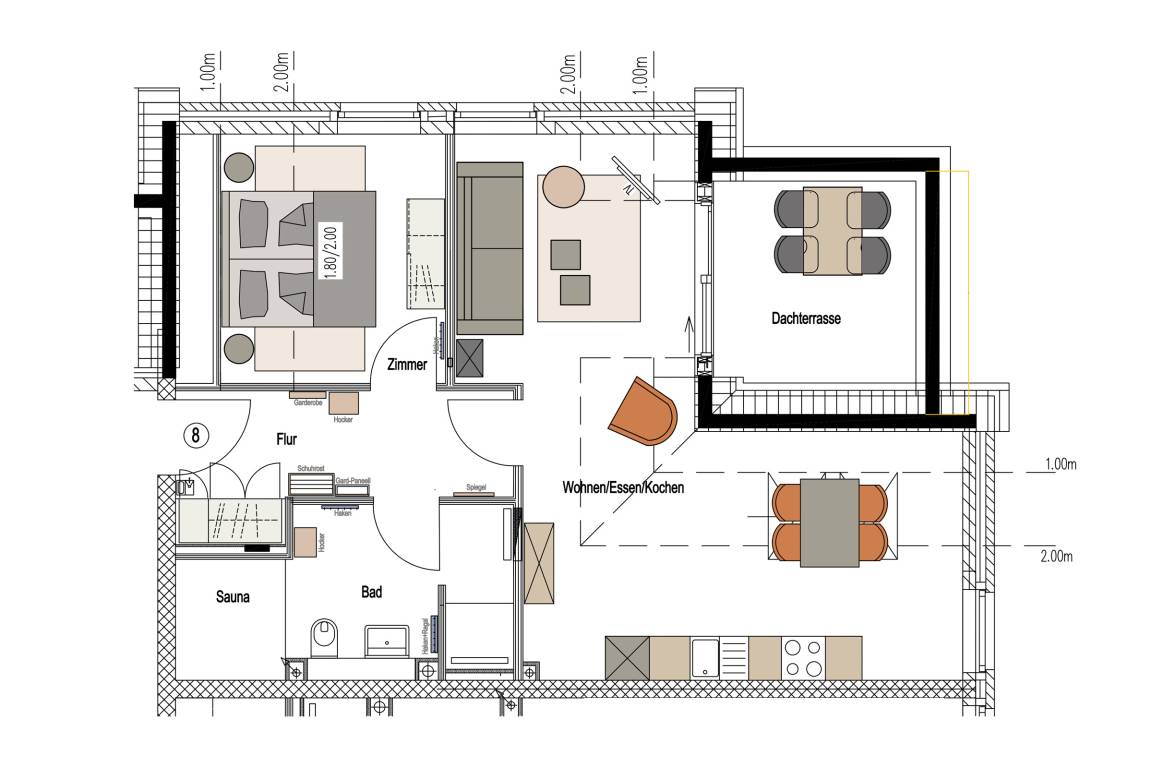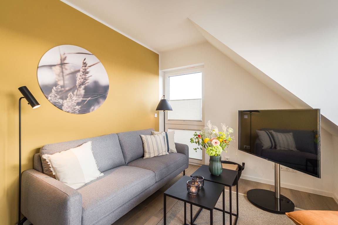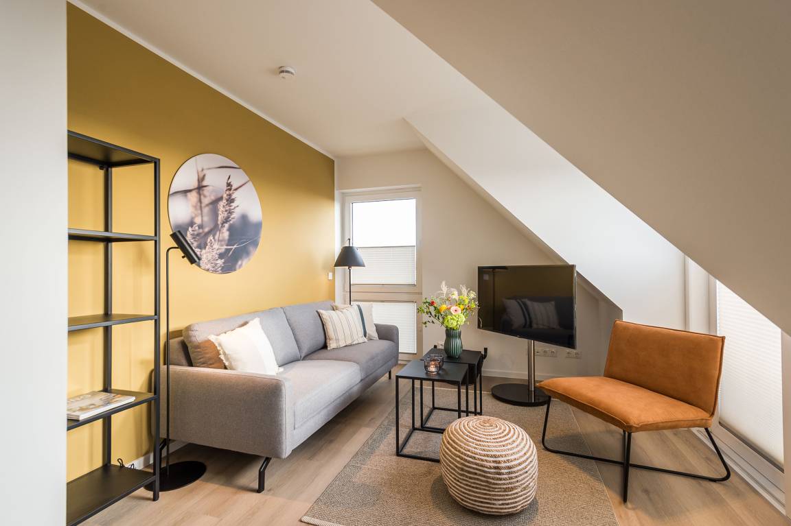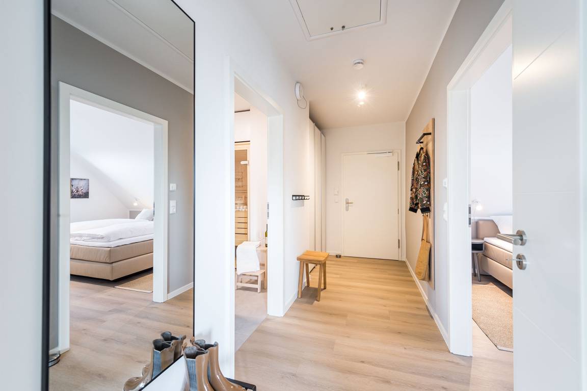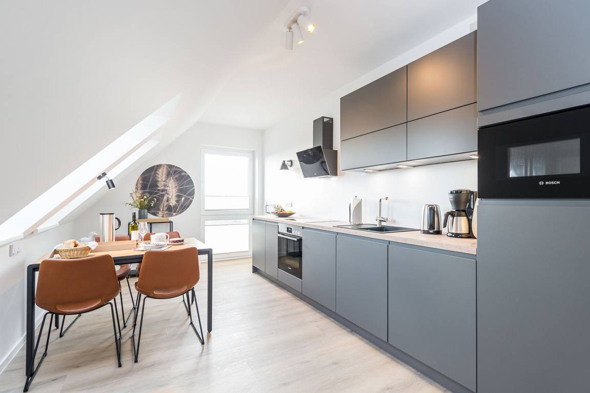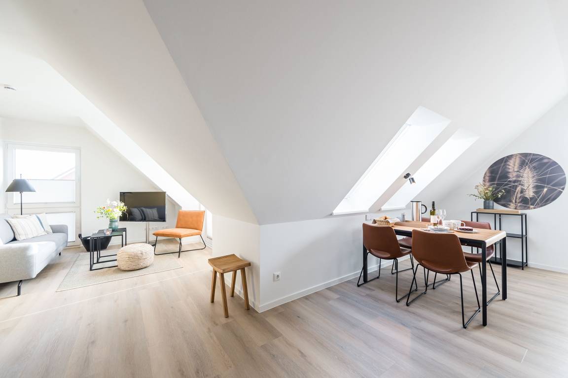 Die 56 m² große Dachgeschoss-Wohnung Peter's Lodge № 8 steht nach der Fertigstellung erstmals zur Vermietung zur Verfügung. Die moderne Wohnung ist nur wenige Meter vom Strand und der Ostsee entfernt (100 m Luftlinie).