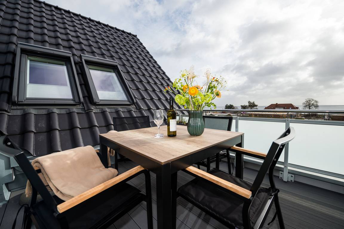 inkl. Gefrierfach, eine Mikrowelle sowie einen Waschtrockner. Im Wohnbereich erwartet Sie ein 50-Zoll-Smart-TV sowie der Zugang zur Dachterrasse. Die Dachterrasse ist ebenfalls mit einem Esstisch ausgestattet und bietet einen herrlichen, frontalen Blick auf die Ostsee. Selbstverständlich bieten wir schnelles und kostenfreies WLAN sowie einen PKW-Stellplatz direkt am Haus. Auf den hauseigenen Parkplätzen stehen Ihnen E-Auto-Ladegeräte (Wallboxen) zur Verfügung (gegen Gebühr). Aufgrund der Allergiker gerechten Ausstattung sind Haustiere nicht erlaubt.