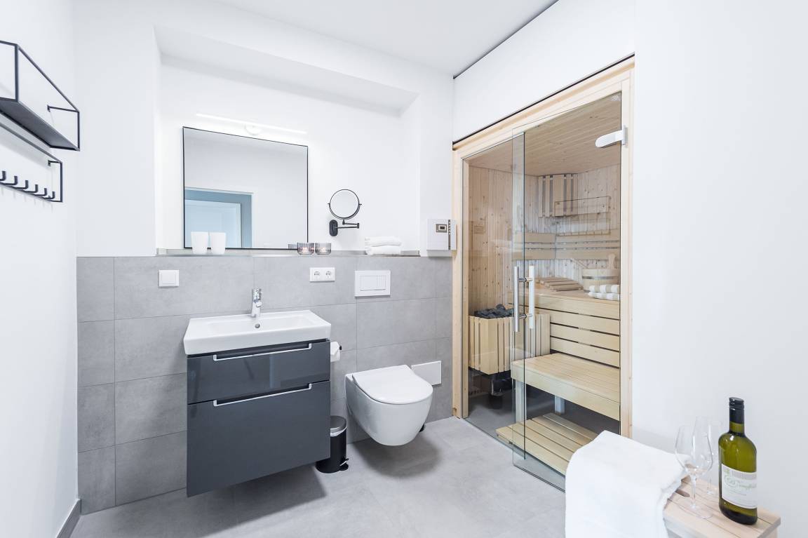 Sie ist für bis zu 2 Personen buchbar (1 Schlafzimmer mit Doppelbett 180 x 200 cm) und verfügt über eine gehobene 5-Sterne-Ausstattung: 1 Badezimmer, 1 Sauna sowie 1 Dachterrasse (frontaler Meerblick). Die Küche ist komplett ausgestattet und bietet zudem einen Esstisch für bis zu 4 Personen. Zudem gibt es einen Geschirrspüler, einen Kühlschrank
