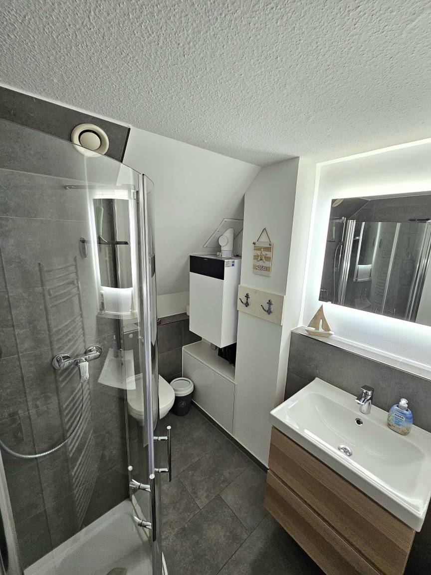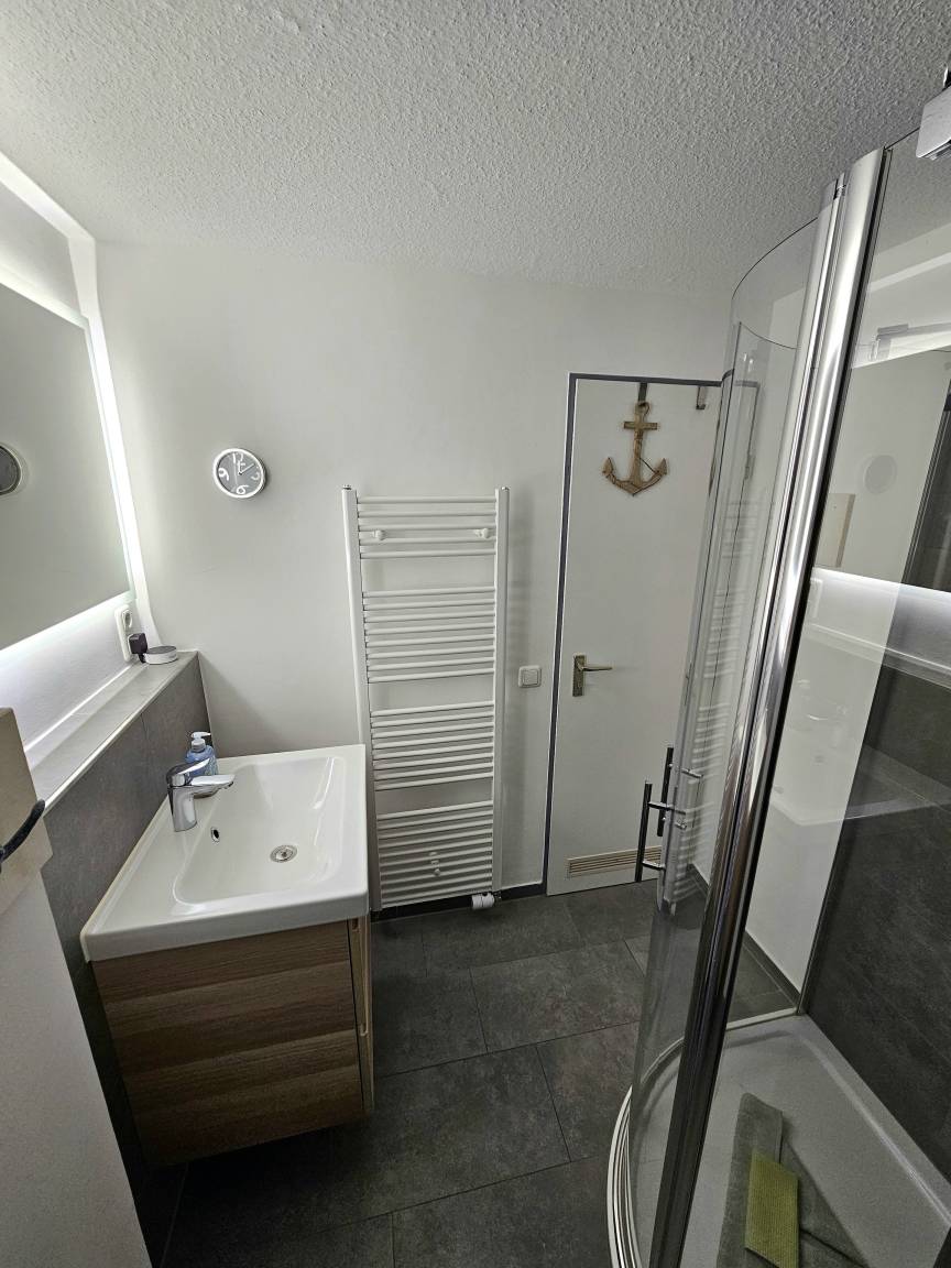 Das neu renovierte Badezimmer ist mit WC, Waschbecken und Dusche versehen. Ein Haartrockner steht zur Verfügung.