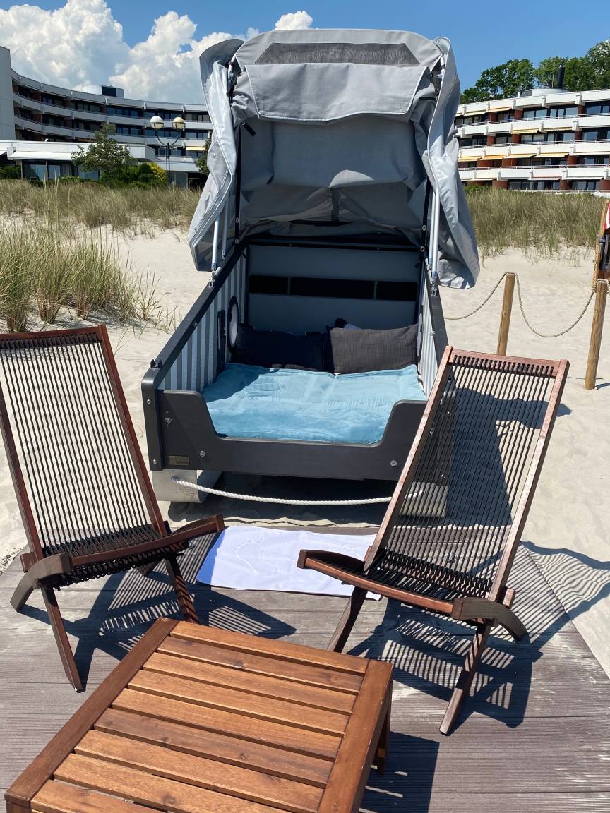 Einmal in die Sterne blicken und romantisch zu Zweit eine ganze Nacht am Strand verbringen. Der Korb steht nah an der Düne und der Promenade im Windschutz mit Blick auf die Ostsee.